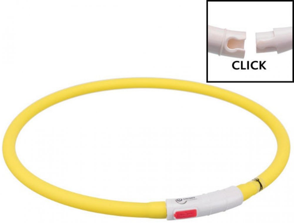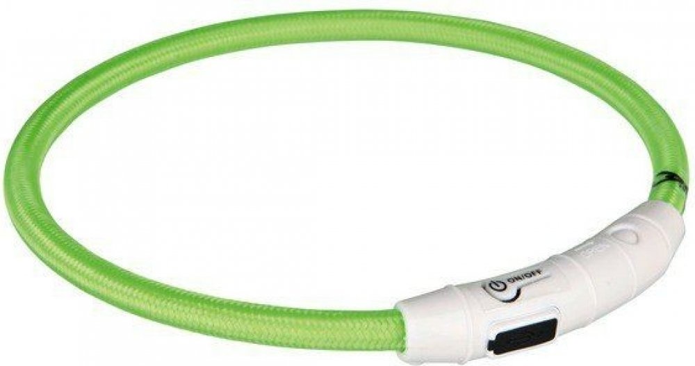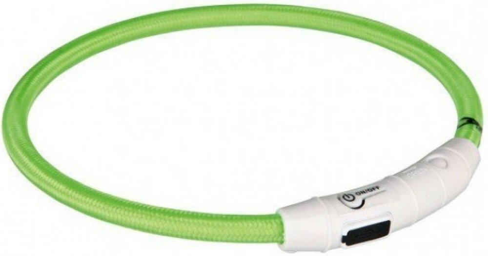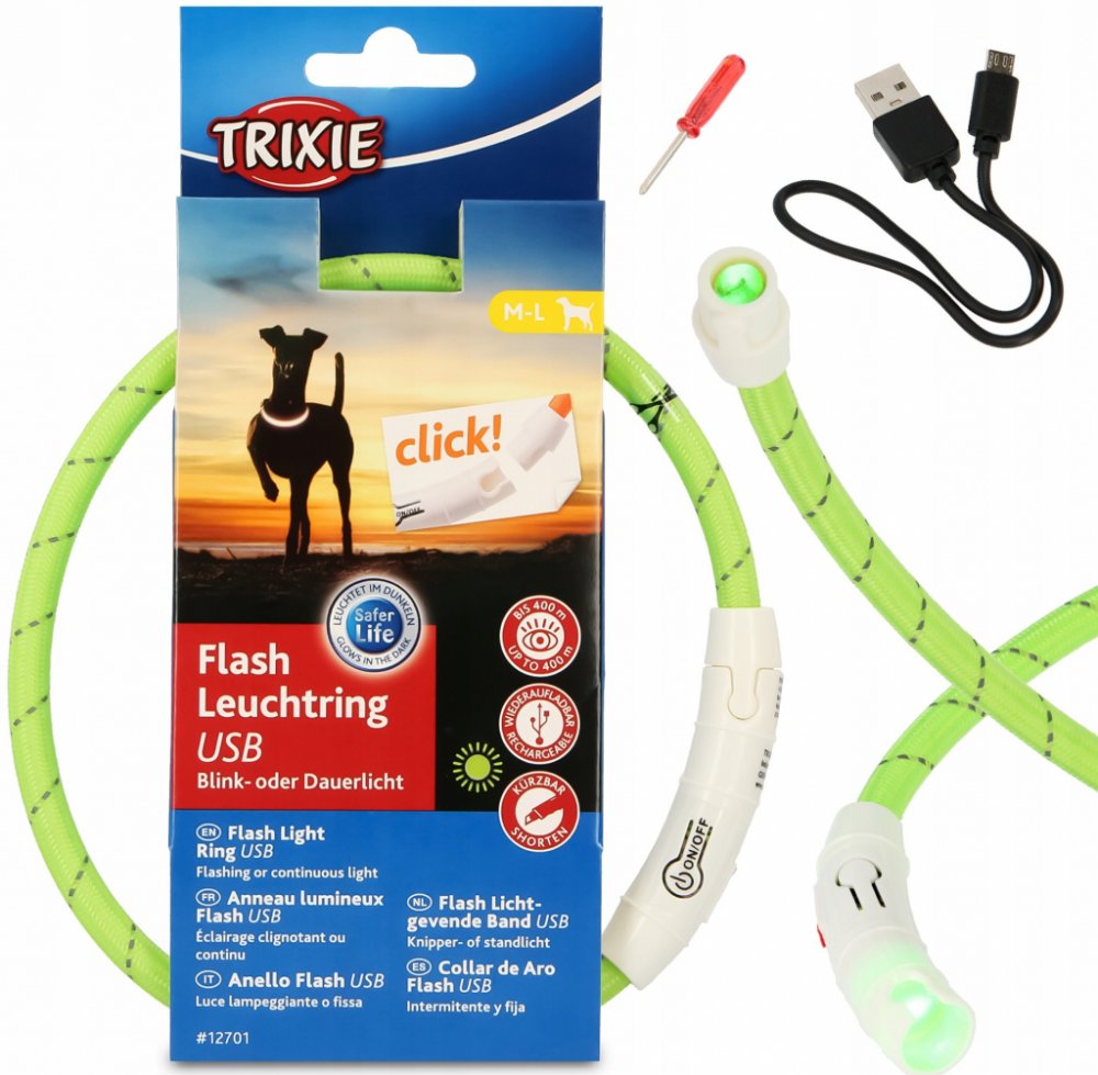 Kroužek pro psy Trixie zlepšuje viditelnost psa na vycházkách při snížené viditelnosti. Procházky ve tmě i v šeru budou s tímto obojkem bezpečnější. Obojek pro psy ustavičně svítí po dobu cca 3 h nebo bliká po dobu cca 5 h. Kroužek je potažený látkou a je odolný proti vlhkosti, takže není problém jej psovi nasazovat i během pochmurného počasí. Instalace obojku na krk psa je velmi snadná. Postačí zacvaknout konce k sobě. V případě, že je velikost příliš velká, není problém obojek zaříznout v potřebné délce. Součástí balení je kromě kroužku i šroubováček a USB kabel k nabíjení.
