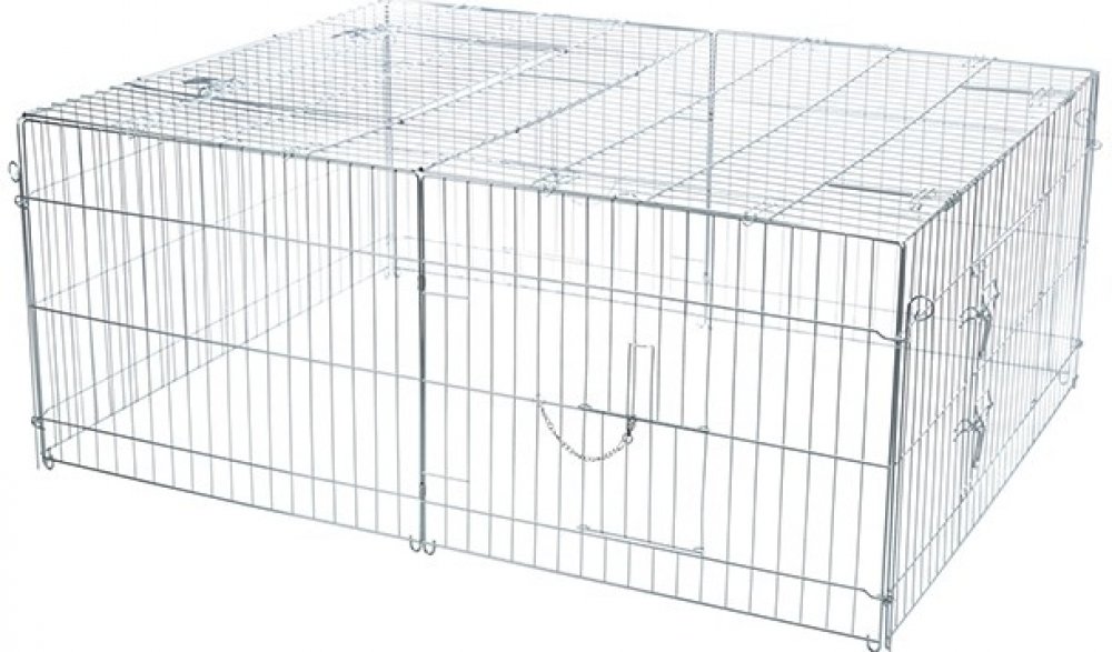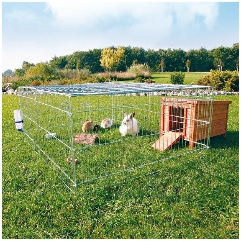Trixie Freilaufgehege mit Abdeckung - tato pozinkovaná ohrádka zajistí Vašemu zvířátku maximální možnou ochranu a pohodlí. Snadná montáž. Ohrádka je vybavena dvířky v horní mříži, dvěma padacími dvířky, ke kterým můžete přistavit domeček, a velkými bočními dvířky. Pevná horní mříž zabraňuje vyskočení zvířátka a zároveň ho chrání před napadaní kočkou nebo dravými ptáky. Domek Natura vhodný k přista...