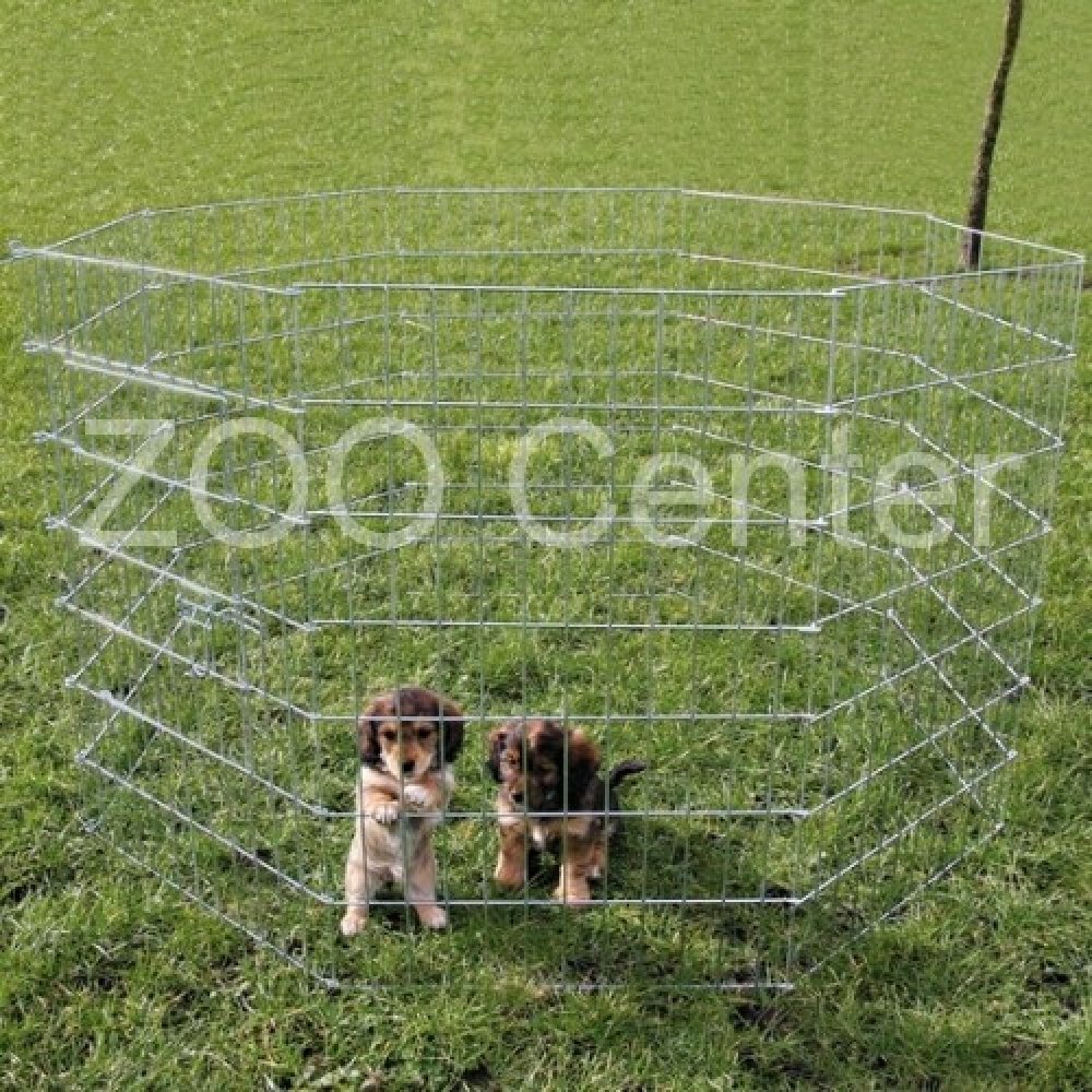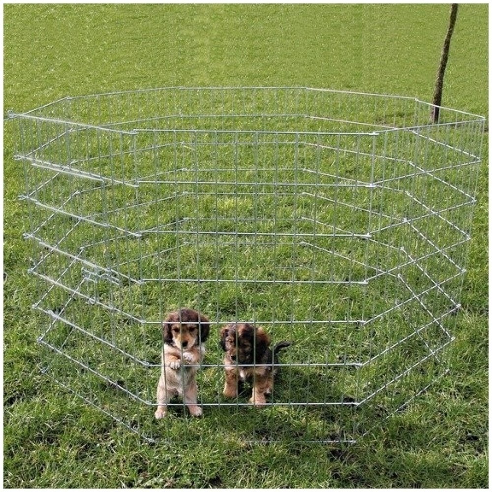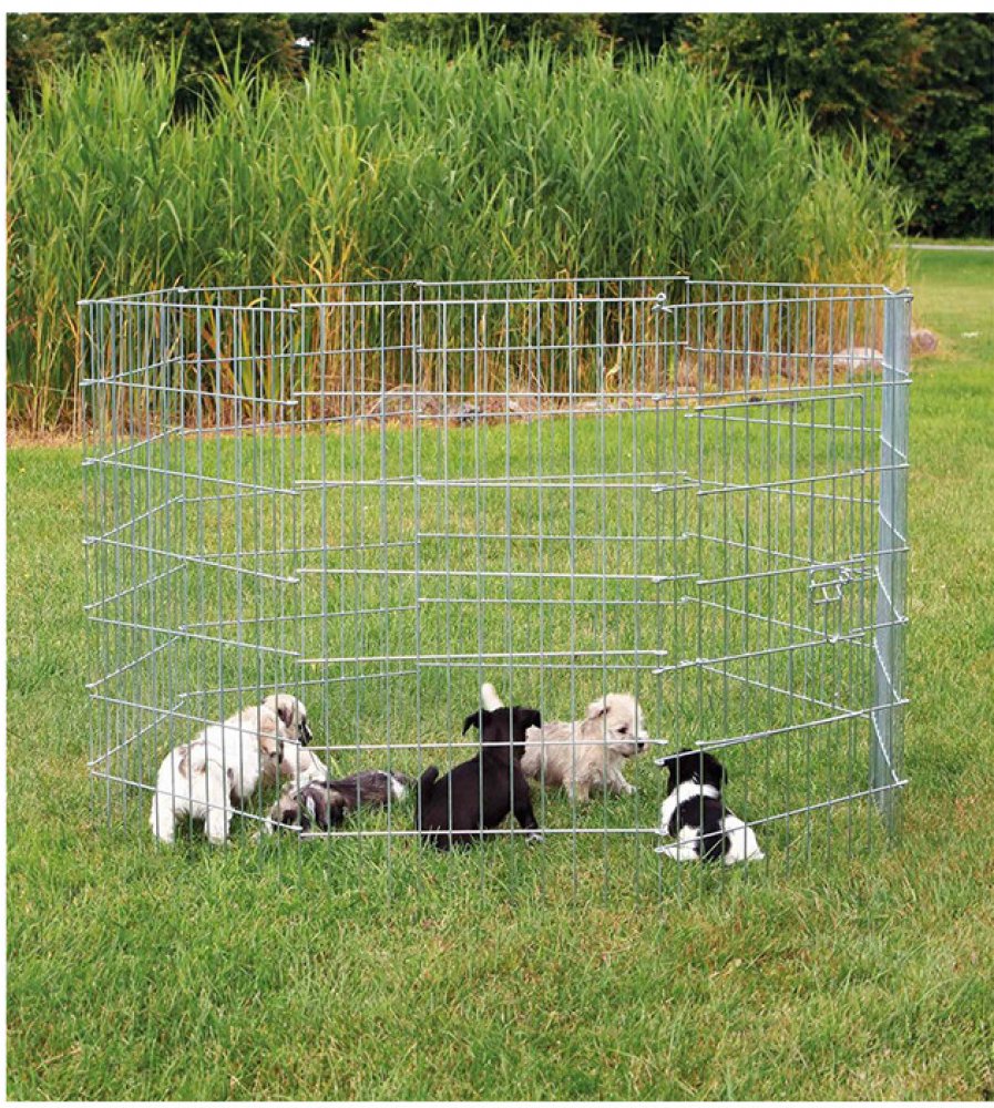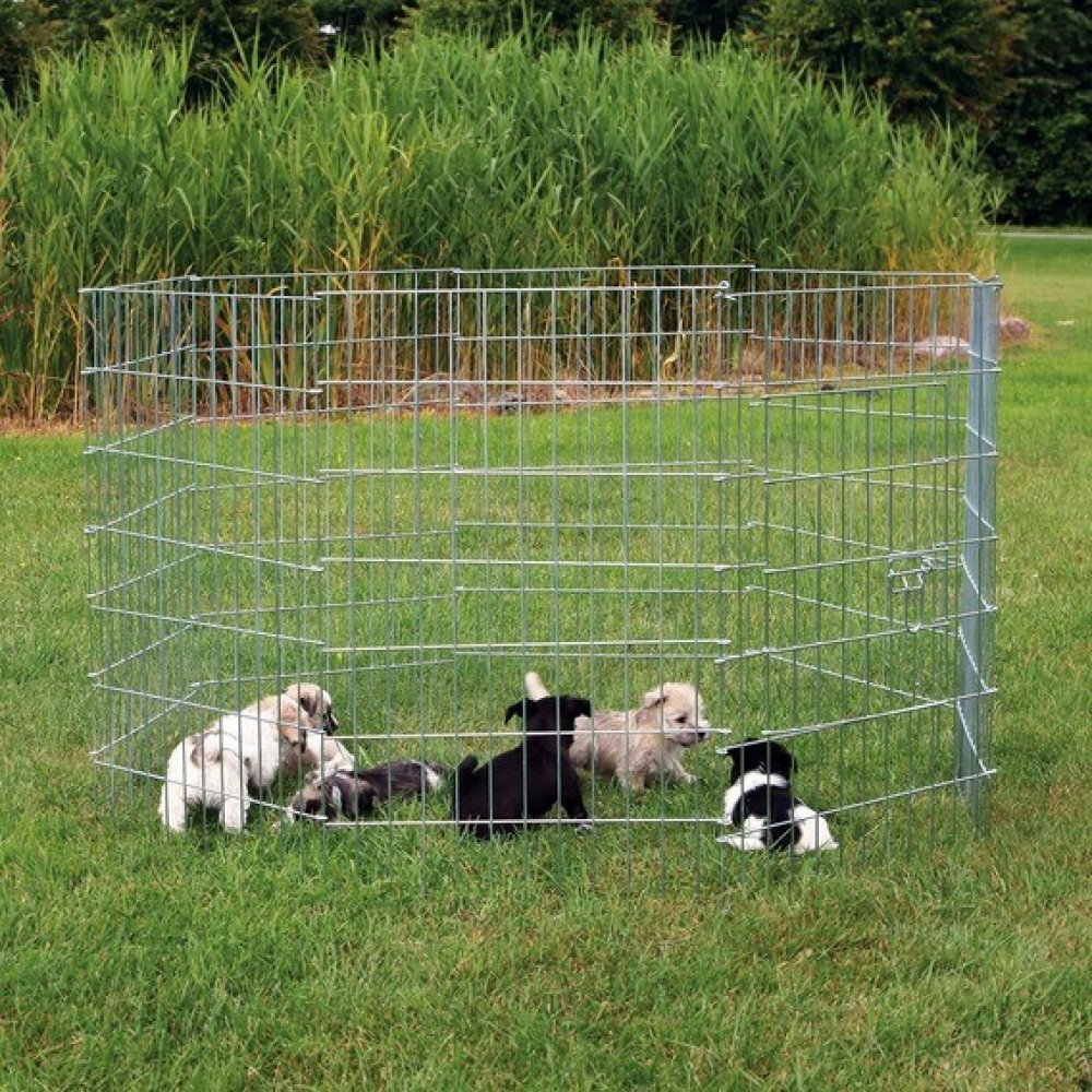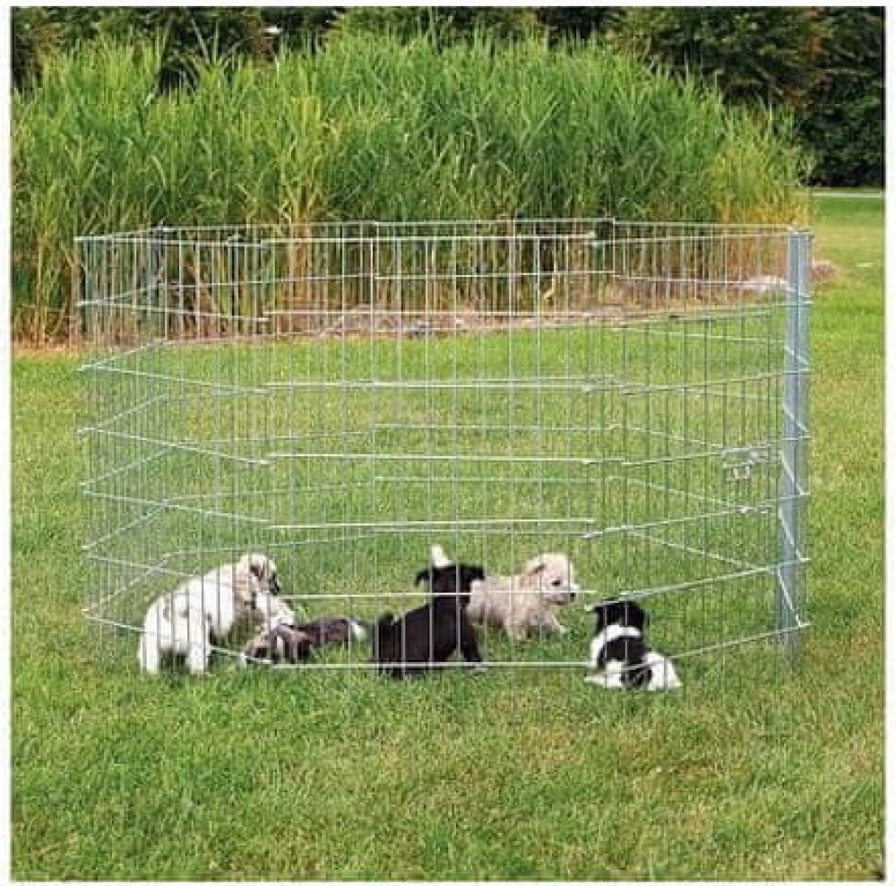Pozinkovaná ohrádka pro štěňata s dvířky. Skládá se z 8 dílků o velikosti 60 cm x 91 cm. Výška ohrádky 91 cm, průměr 1,5 metru. Pro domácí i venkovní použití. Praktický pomocník při odchovu štěňat. Velikost jednoho dílku: průměr 60 x výška 91 cm.
