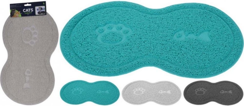 PVC podložka na krmení pro psy a kočky k umístění pod misky s vodou a krmivem pro domácí mazlíčky. Protiskluzový, voděodolný. Snadno se čistí tekoucí vodou. Rozměr 46 x 26 cm.