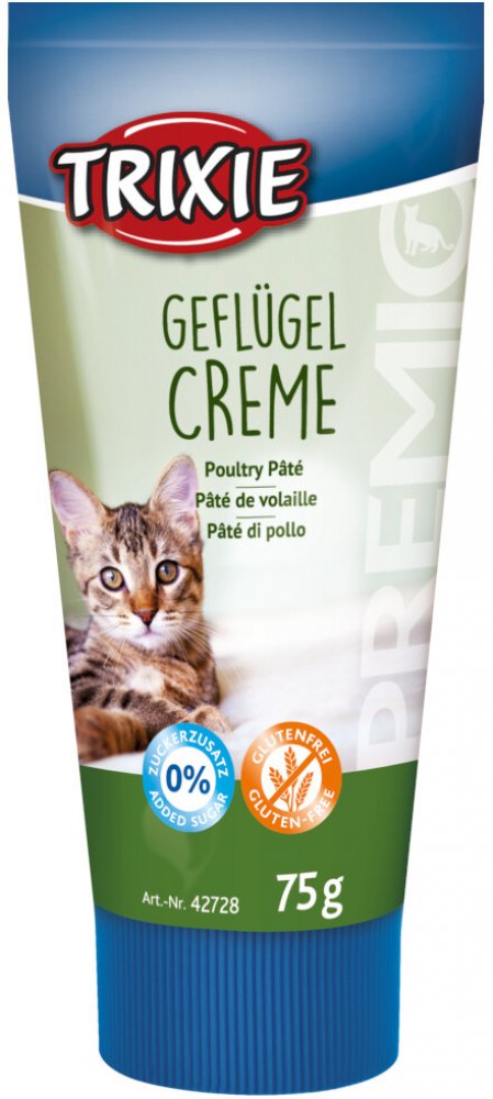 Krém Trixie Premio obsahuje spoustu výtečného drůbežího masa. Je proto vhodný jako výjimečná odměna nebo svačinka. Lahodné chuti této paštiky žádná kočka neodolá. Výrobek neobsahuje přidaný cukr ani sůl, můžete tak svého kočičího mazlíčka odměnit bez špatného svědomí. Drůbeží krém je vyrobený výlučně v Německu. Díky praktické tubě je podávání velmi snadné. Paštika Vám také usnadní podávání léků, p...