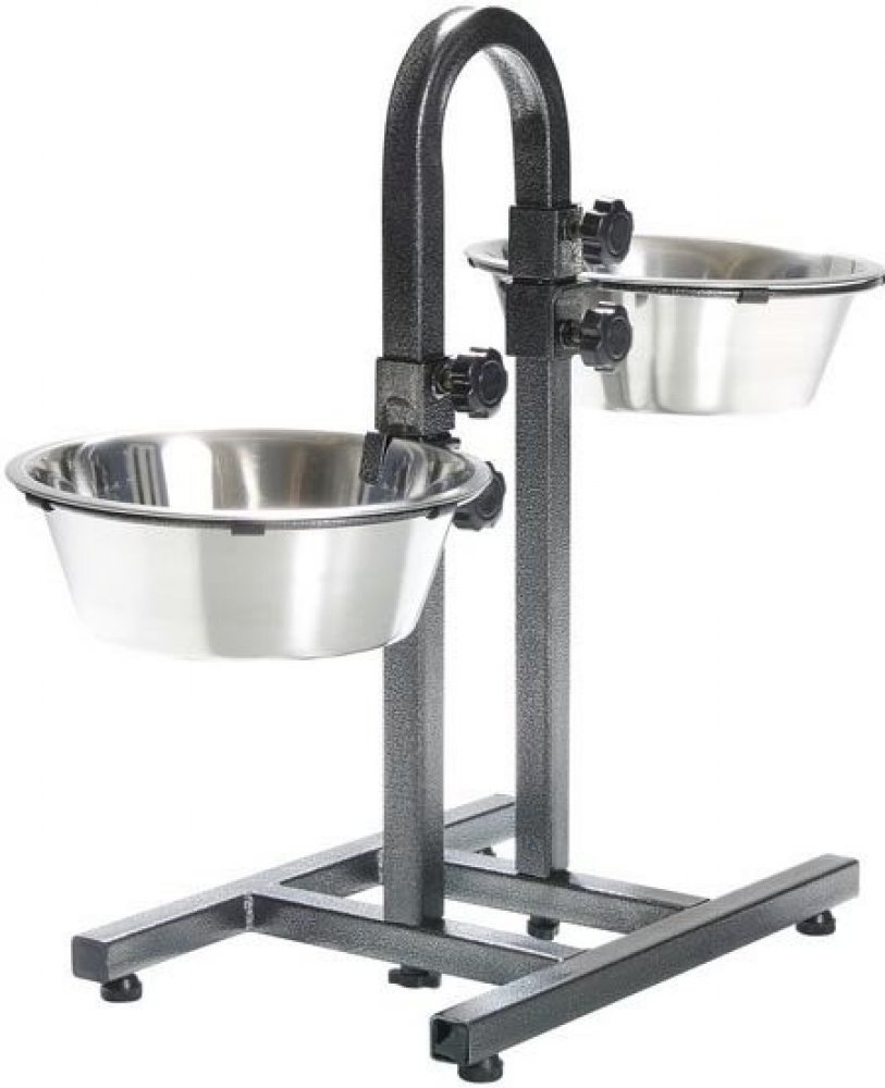 Praktický stojánek s miskami - eliminuje převržení misek a vysypání jejich obsahu, šoupání s miskami a pod. Navíc se kočka či pes nemusí u krmení hrbit. Misky jsou vyrobeny z nerezové oceli, můžete je mýt i v myčce. Objem jedné misky je 2,8 l, průměr 24 cm. Tato velikost je vhodná pro velká plemena.