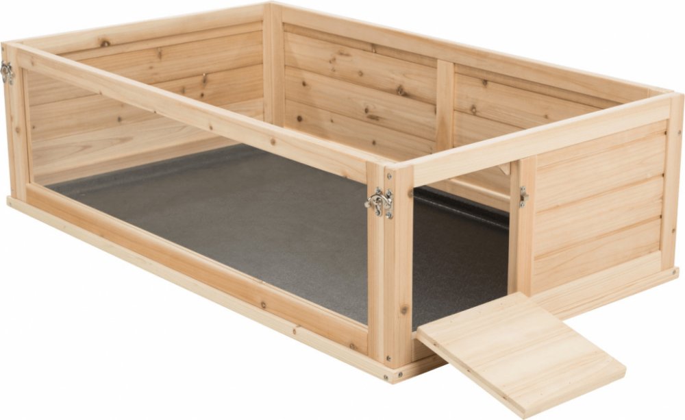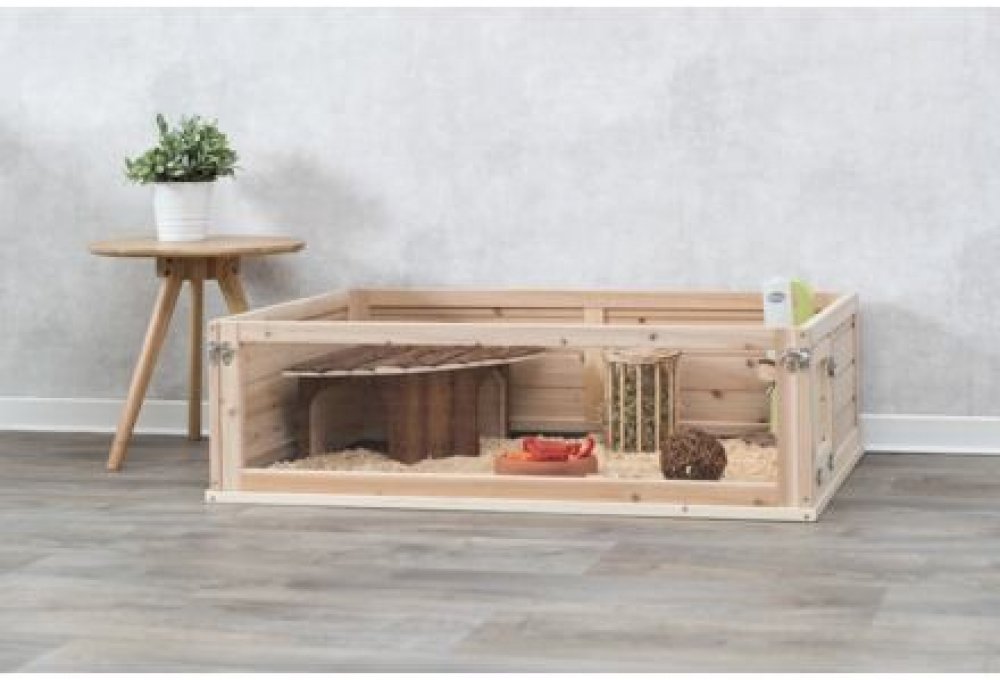 Tento produkt je vyroben z neošetřovaného dřeva a akrylového skla a nabízí vašim mazlíčkům dokonalý prostor, který se skvěle hodí na spaní. Výběh je opatřen přední stěnou s akrylátovým sklem a má odnímatelná a uzamykatelná boční dvířka. Lze jej kombinovat s ohrádkou, která není součástí dodávky.