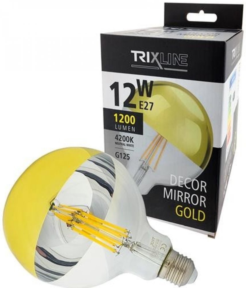 LED ŽÁROVKA TRIXLINE s paticí E27 typ G125 a příkonem 12W.Tyto žárovky jsou na oko velice přitažlivé, výjimečné a zvláštní zároveň. Speciální jsou svou funkcí nepropouštění světla přes část skla žárovky. Naopak ho právě odráží směrem zpět díky zrcadlové vrstvě bez oslnění, čímž chrání i vaše oči.Je to skvělá volba do lampy či světla v blízkosti televize, jelikož se vám světlo nebude odrážet v obrazovce, ale přesto budete mít dostatek světla v místnosti, tak jak jste zvyklí. Tento typ žárovky je vhodné použít do stolních a nástěnných svítilen bez stínidla, zavěšení lamp, lustrů. Lze zakomponovat do všech interiérů, zaleží jen na vaší fantazii.- Poloviční chromovaný design- Nízká spotřeba energie- Nízký vývoj teplaTechnické parametry:- Energetická třída: F- Příkon (W): 12- Napájecí napětí (V): 230- Stmívatelná: Ne- Životnost: 20000 h- Teplota světla (K): 4200- Barva světla: Neutrální bílá- Úhel svícení (°): 360- Výška produktu: 170 mm- Průměr produktu: 125 mm- Světelný tok (lm): 1200- Patice: E27