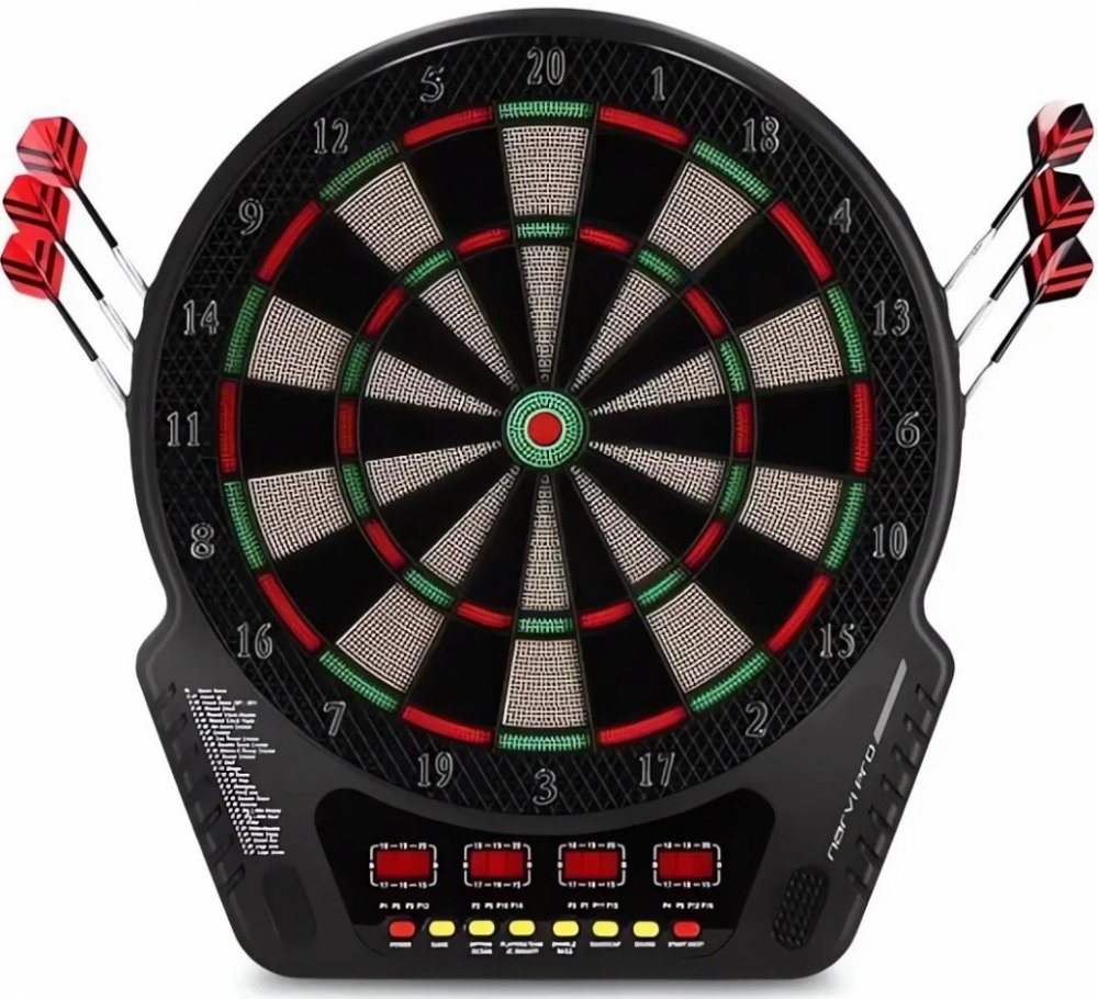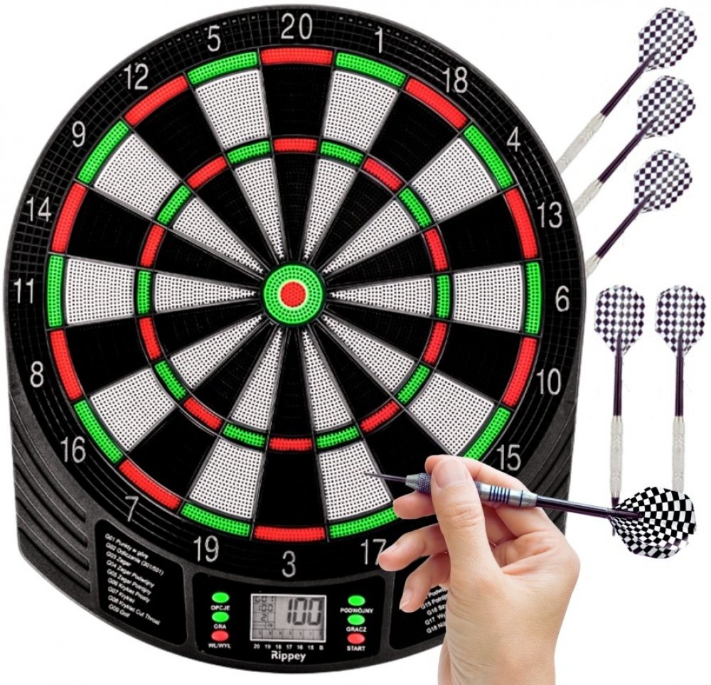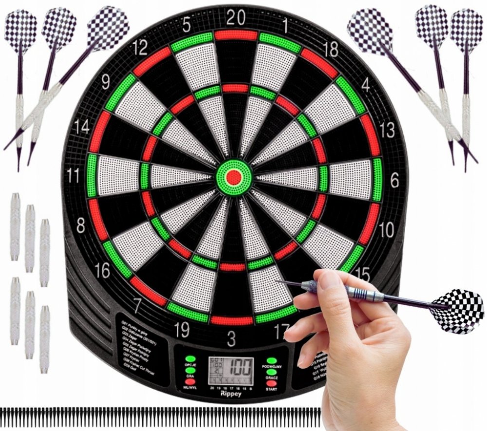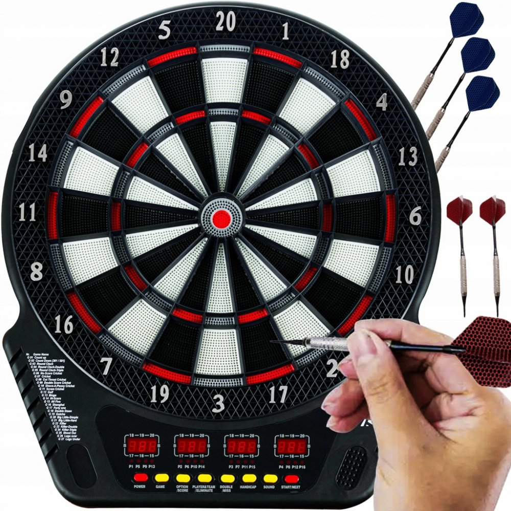- VELKÝ PRÉMIOVÝ ČÍSELNÍK - disk má odolnou a dlouhotrvající konstrukci, která umožňuje bezproblémové používání po dlouhou dobu. Elektronická funkce zajišťuje přesné rozpoznání zásahu, díky čemuž je hra napínavější a výsledky přesné a spravedlivé. Šipkový terč je velký, s průměrem zásahového terče 34,5 cm. Kromě toho má na výběr z 27 vestavěných her. Šipky jsou součástí sady.