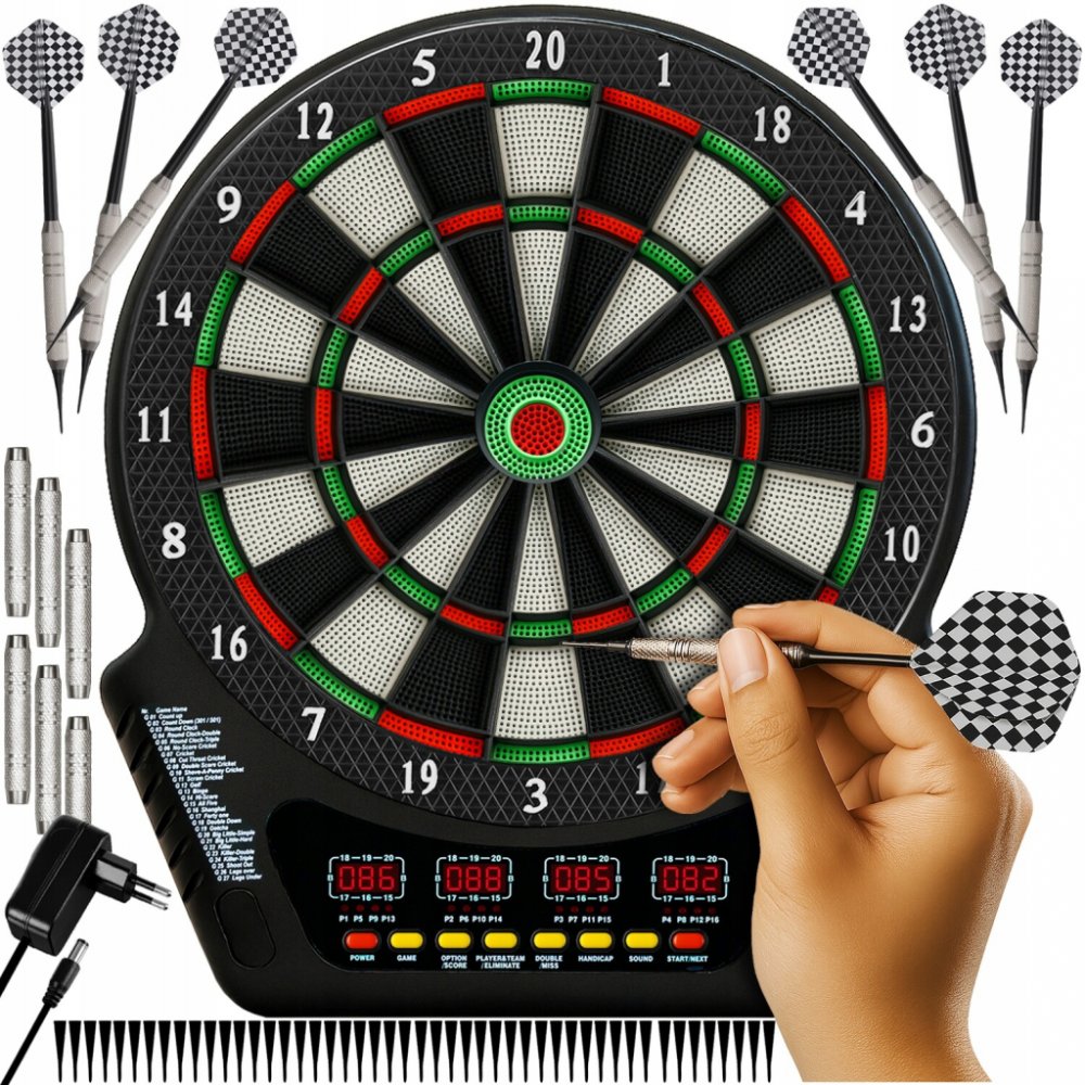 - LCD DISPLEJE - umístěné na hrací ploše, poskytují informace o aktuálním stavu hry a skóre jednotlivých hráčů a týmů. Také se zvukovými signály. Přístroj je napájen z elektrické sítě nebo prostřednictvím 4 baterií AA. Profesionální elektronické šipky - šipková hra se bude dobře hodit i jako dárek.