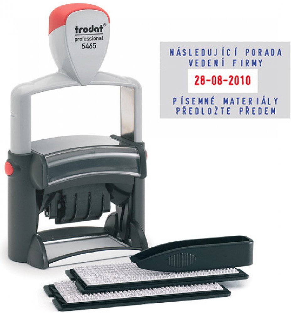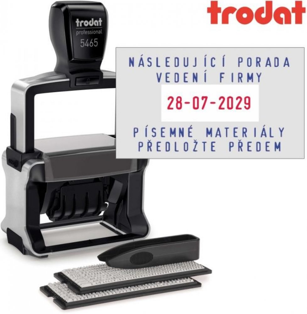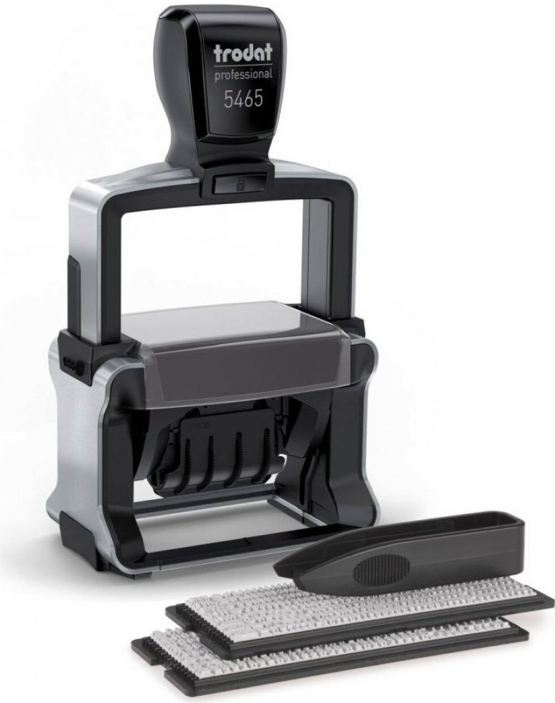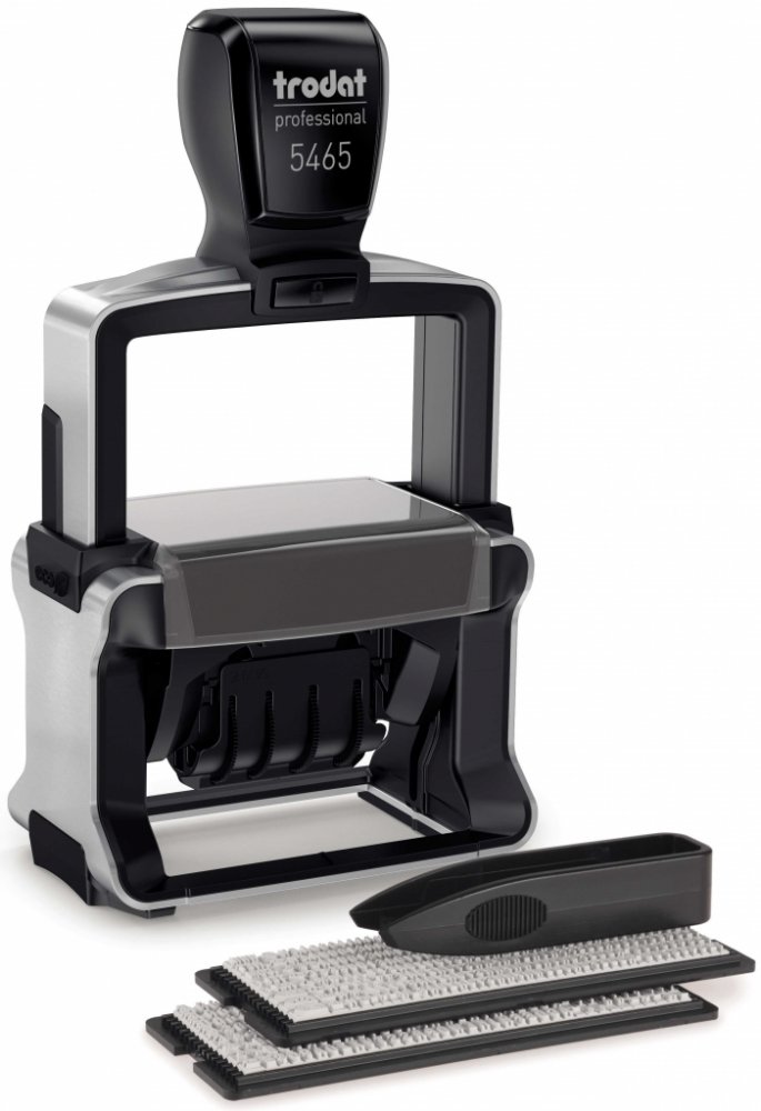 Trodat Professional Typomatic 5465 je kvalitní kovové textové a datové (datumové) samobarvicí razítko typu "sestav si sám". Razítko má na sestavení vlastního textu maximálně 4 řádky textu a nastavitelné datum. Řada razítek Trodat Professional obsahuje vysoce kvalitní a velmi pevná razítka s dlouhou životností.