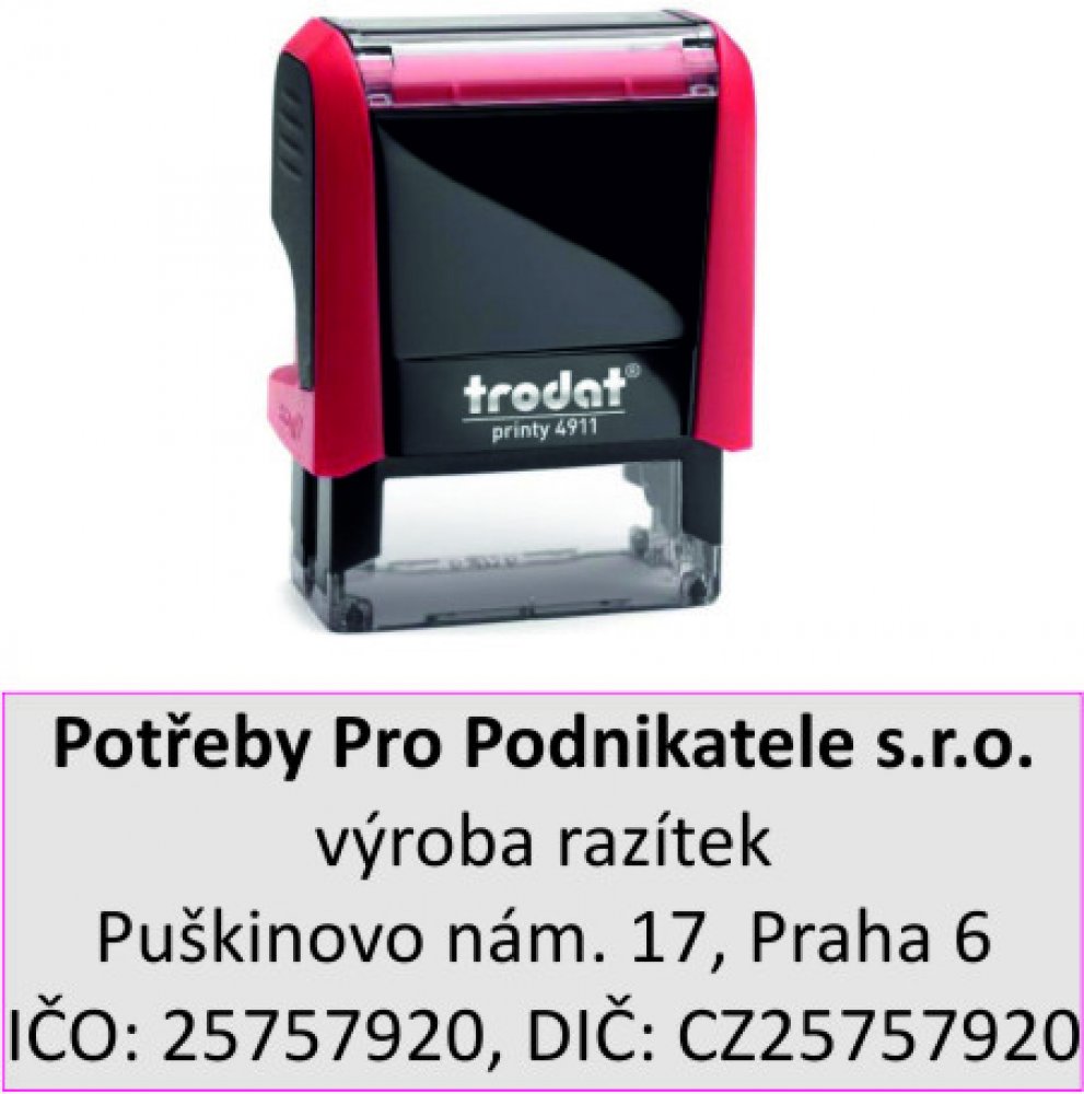 Plastové samobarvící razítko (strojek a poduška)Při objednání tiskového štočku posíláme grafickou korekturu.Standardní barva otisku: černá.