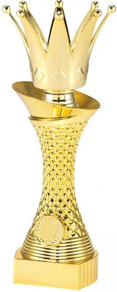 Trofej KRÁLOVSKÁ KORUNA - zlatána zlaté noze, ve velikostech 23,5cm, 25,5cm a 27,5cm. Na nohu lze umístit libovolný sport - konkrétní sport dle fotky produktu.Možná varianta i bez emblému. Pokud emblém nechcete stačí ponechat volbu prázdnou.(štítek - 52x18, 55x20, 60x25)