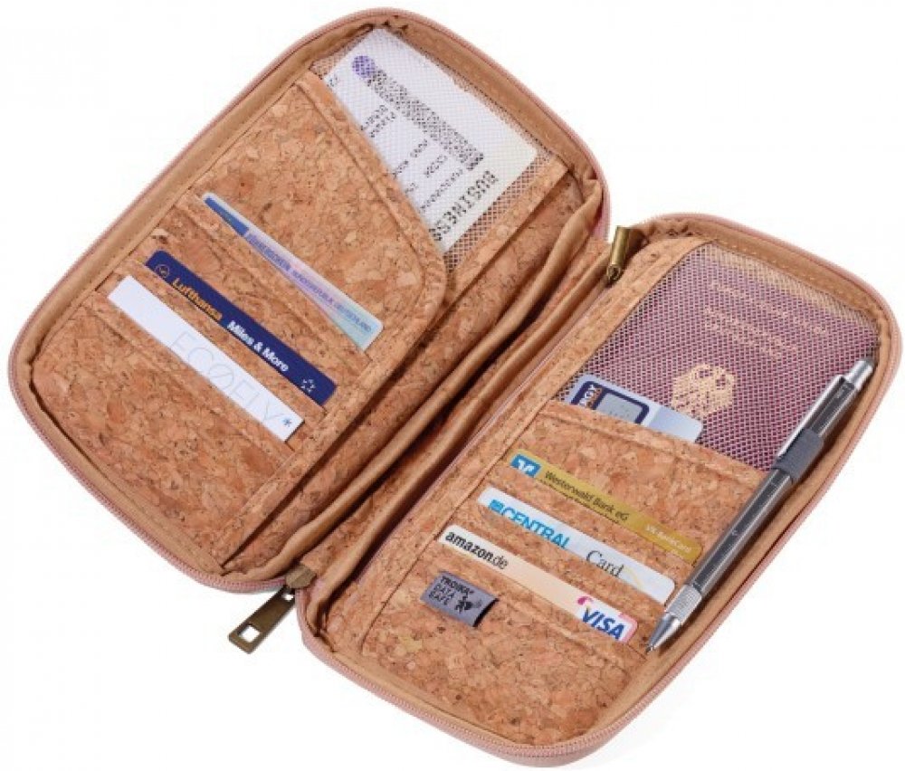 Pouzdro na cestovní doklady, s ochrannou fólií proti čtení (pro RFID čipy), zip, 12 vnitřních přihrádek, 50% polyester/50% korek, poutko na pero, korek/polyester, matná, hnědá