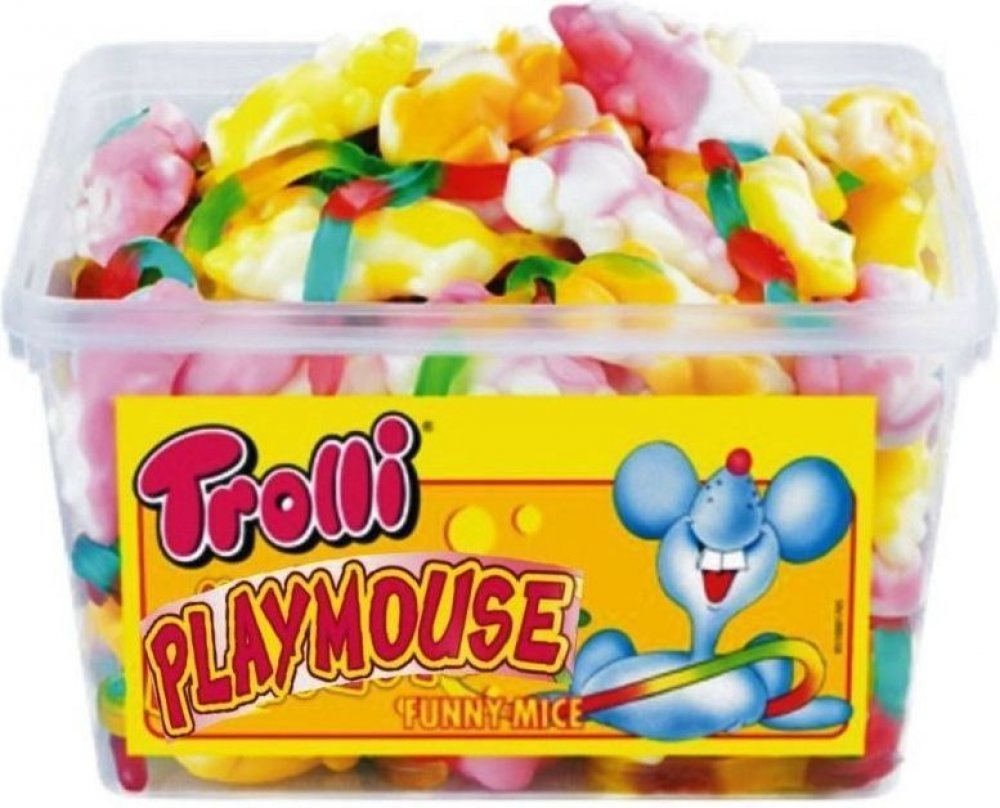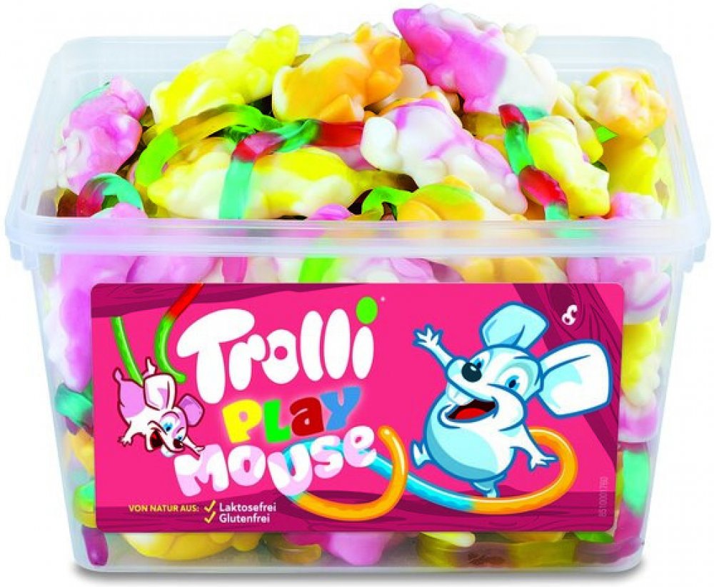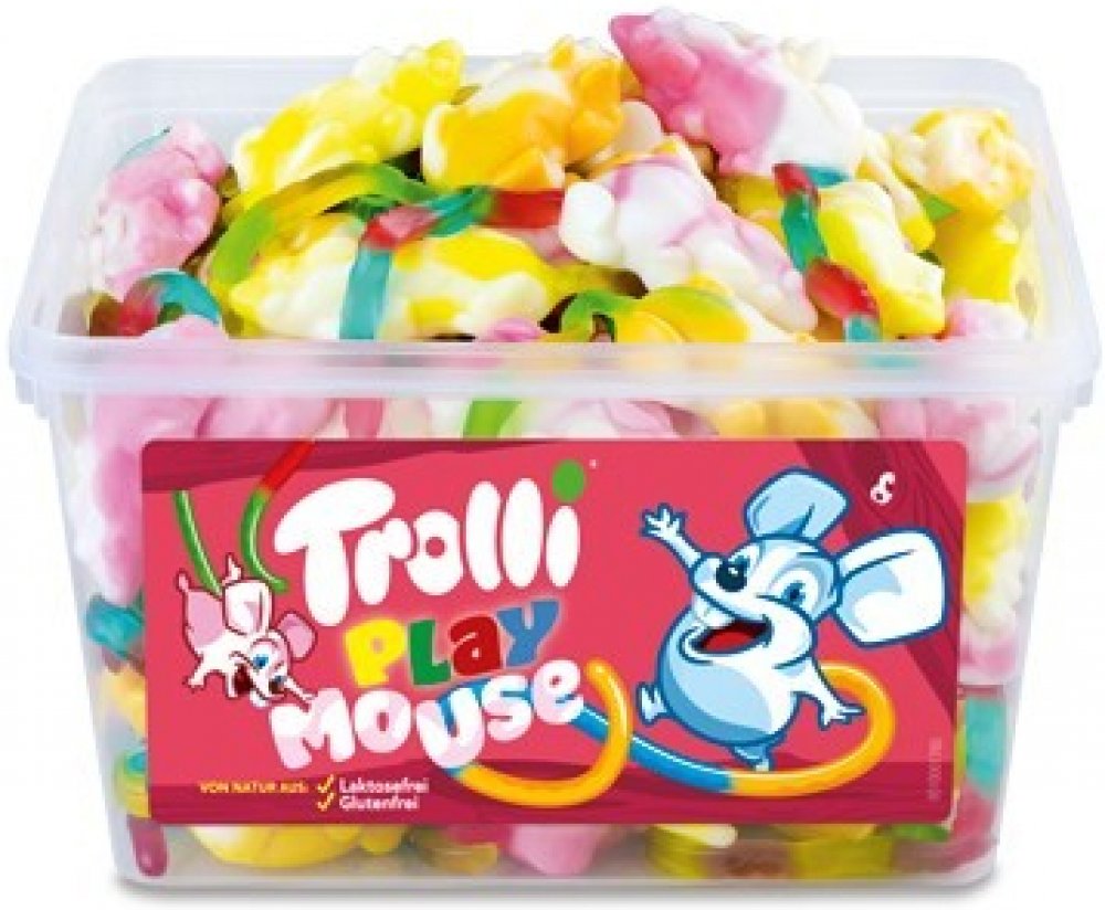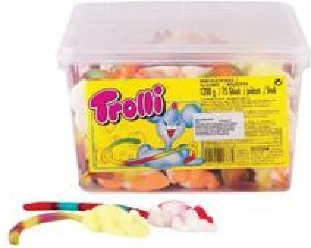 Ovocné želé myši, různé příchutě. S přírodními barvivy.Složení: glukózový sirup; cukr; želatina; kyseliny (kyselina citrónová a mléčná); barviva (černý rybíz, mrkev, kurkuma, světlice barvířská, citrón, mořská sinice (spirulina), paprika, kopřiva, špenát); želírující látka (pektin); aroma; rostlinný olej (palmový); leštící látka (včelí vosk bílý a žlutý, karnaubský vosk).Výživové údaje na 100 g: Energetická hodnota 1433 kJ/ 337 kcal, Tuky 0,1g, z toho nasycené mastné kyseliny 0,1g, Sacharidy 77g, z toho cukry 48g, Bílkoviny 5,5g, Sůl 0,2gSkladování: Chraňte před teplem a vlhkem.KontaktTrolli GmbH, Oststr.94, 90763 Fuerth