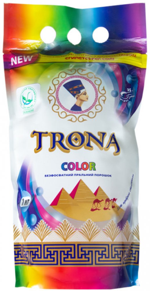 TRONA Color Prací prostředek na barevné prádlo z bavlněných, lněných a syntetických tkanin. Je vhodný pro automatické pračky i na ruční praní při teplotě 30–60 °C. Neobsahuje fosfáty a zeolity. Přidaný sesquikarbonát sodný umožňuje snížit obsah povrchově aktivních látek a výrazně zvýšit jejich prací schopnost. Skvělý účinek má i při nízkých teplotách. Prostředek dokonale odstraňuje organické nečistoty: mastnotu, olej, skvrny od trávy, čaje, kávy, ovoce, parfémů, aniž by došlo k poškození struktury tkaniny. Dezinfikuje a odstraňuje nepříjemný zápach, je vhodný pro citlivou a dětskou pokožku. Změkčuje vodu a zabraňuje usazování vodního kamene na topných tělesech praček. Složení : TRONA Color: aniontové povrchově aktivní látky ≤ 4%, neiontové povrchově aktivní látky ≤ 1%, sesquikarbonát sodný a hydrogenuhličitan sodný ≤ 35%, elektrolyty, antiresorbenty, křemičitany, inhibitor přenosu barviva, aktivátor TAED, inhibitor inkrustace tkaniny, enzymy, parfémová kompozice.