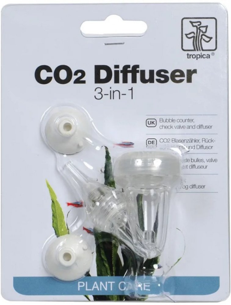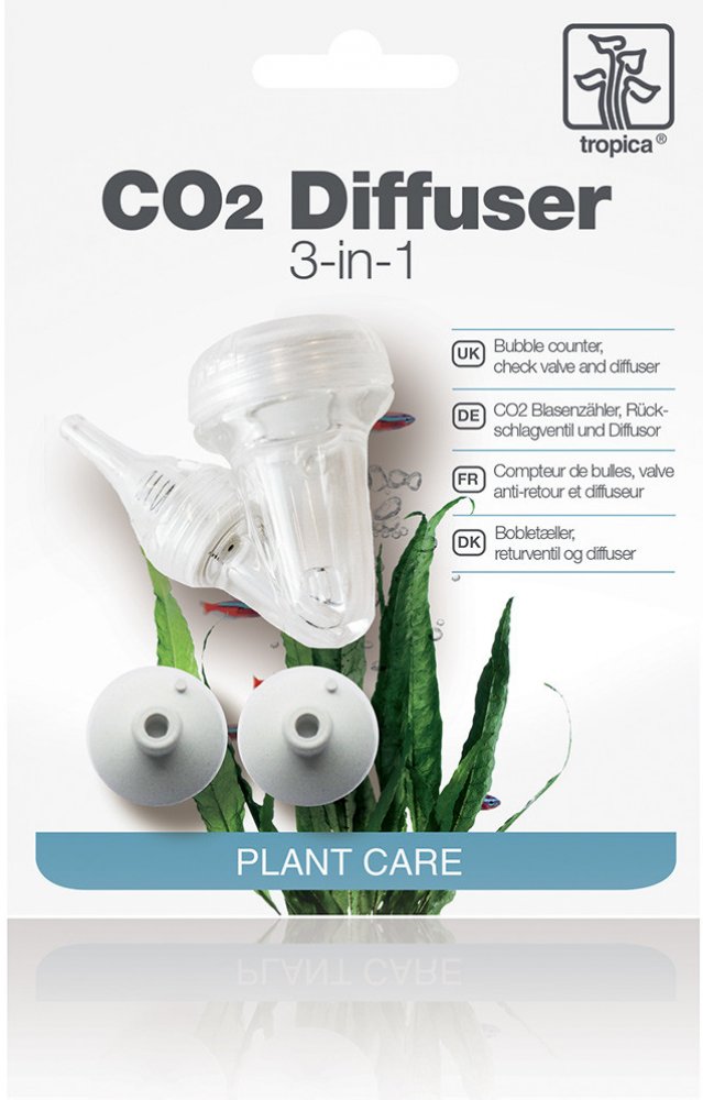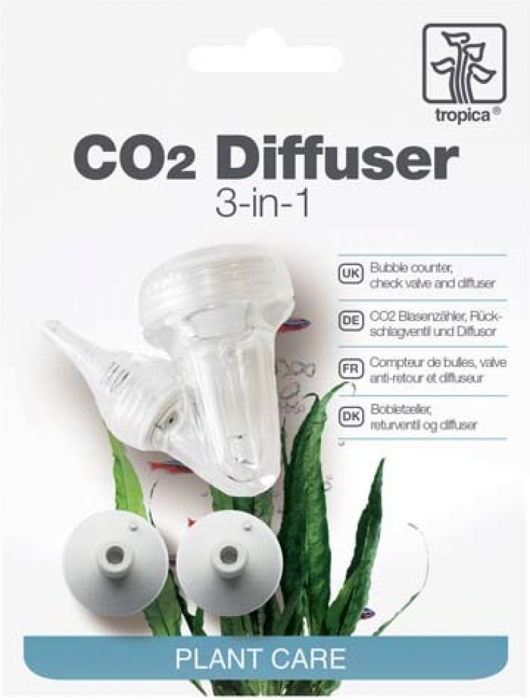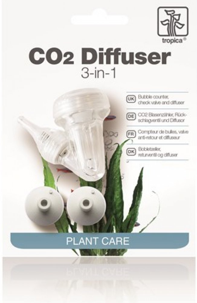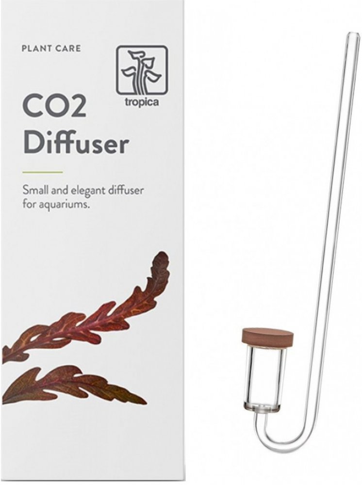 Velmi jednoduchý a praktický difuzor značky Tropica je vyrobený z akrylového skla, aby se podobal dražším skleněným difuzorům a nekazil tak vzhled Vašeho akvária. Velkou výhodou však je, že narozdíl od skleněných difuzorů se dá keramický kroužek tohoto difuzoru velmi snadno vyměnit a vy tak nemusíte pořizovat nový difuzor.Difuzor rozptiluje CO2 na jemnou mlhu a je tak dosaženo efektivní difuze oxidu uhličitého do vody. Tento difuzor je tedy vhodný pro akvária do 150l.Instalace: Sundejte víčko a vyndejte keremický disk, poté napusťte počítadlo bublinek do 1/2 vodou. Opět difuzor složte a počkejte 24h pak difuzor můžete zpustit a nastavit dávkování podle počítadla bublinek. Obsah balení: