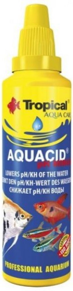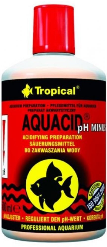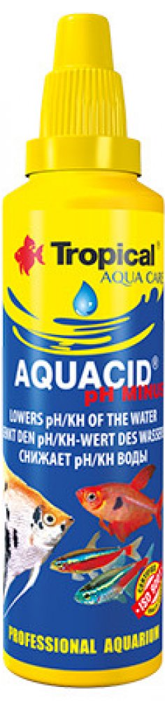 TROPICAL AQUACID pH MINUS je určen k okyselení akvarijní vody. Snižuje reakci vody (pH) a její uhličitanovou tvrdost (KH), podporuje tření ryb, zlepšuje jejich životní podmínky a snižuje jejich náchylnost k onemocnění. Kyselá voda je také charakteristická pro biotop černých vod. Preparát AQUACID pH MINUS neobsahuje kyselinu fosforečnou.