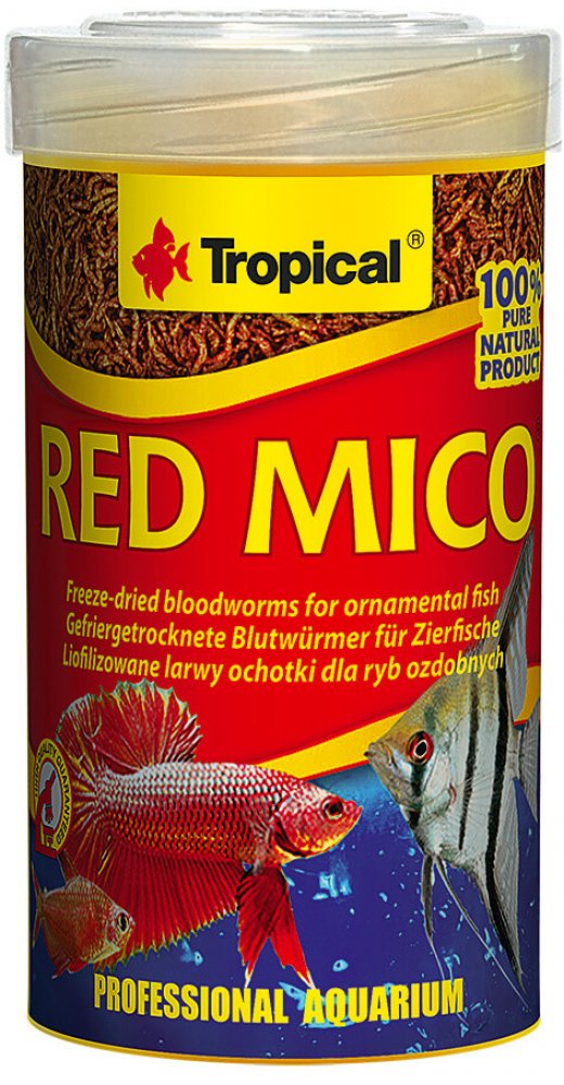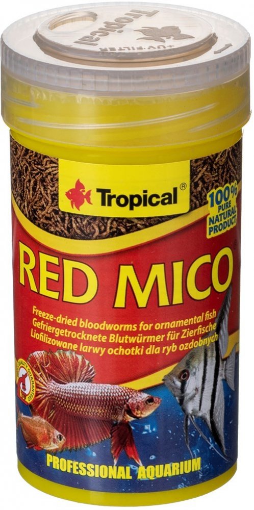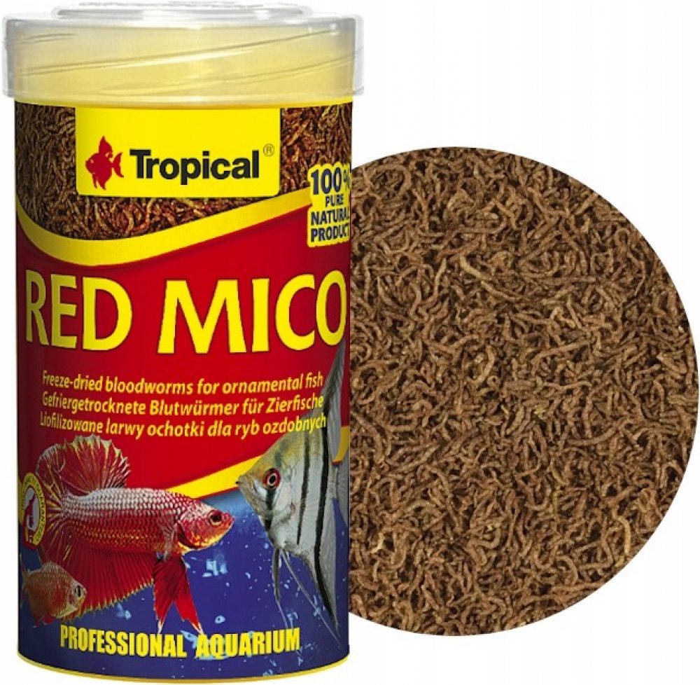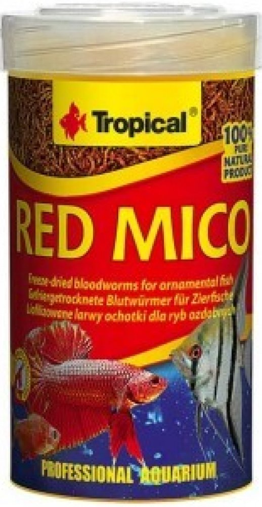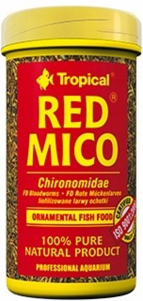 RED MICO pro okrasné ryby. Krmný materiál: liofylizované larvy pakomárů (Chironomus). Analytické složky: hrubý protein 46,0%, hrubé oleje a tuky 1,7%, hrubá vláknina 4,7%, vlhkost 12,0%.