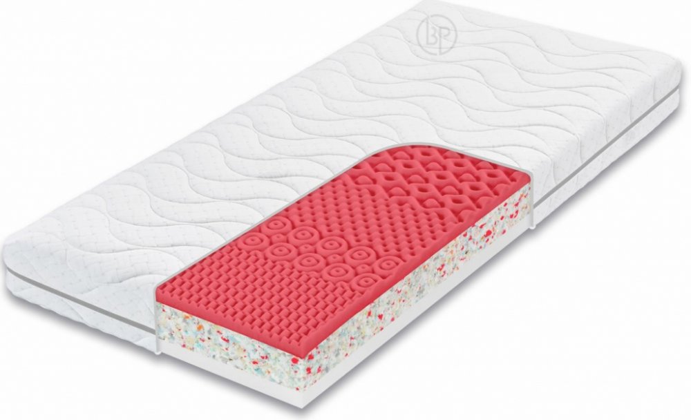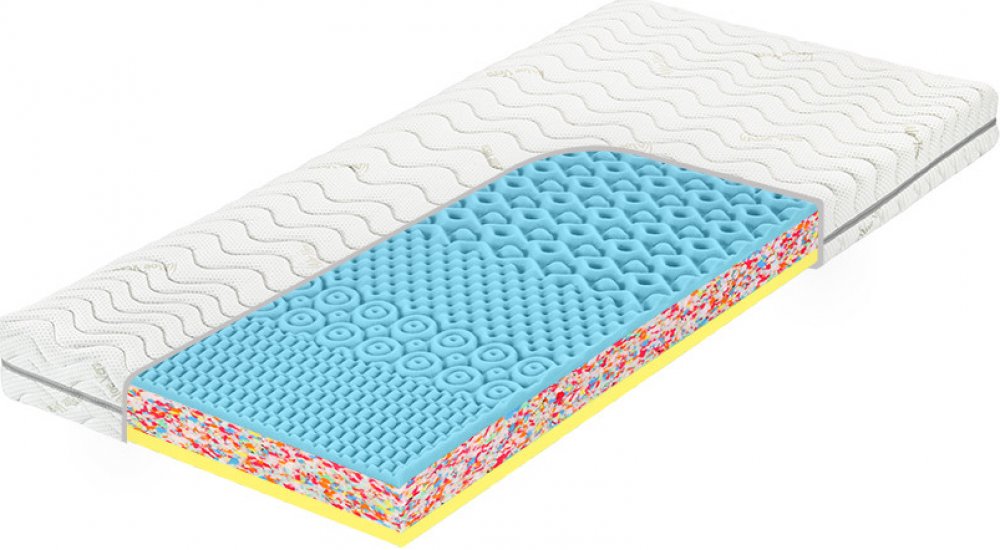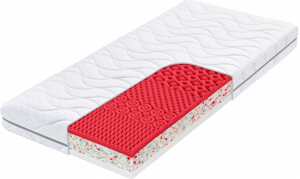 - Flexifoam® (strana hard). Pružná, ale tužší strana nabízí 7 anatomických zón ložná s jemným masážním účinkem pro uvolnění napjatého svalstva a podporu správného krevního oběhu v průběhu spánku, což je u tuhé matrace obzvláště důležité.