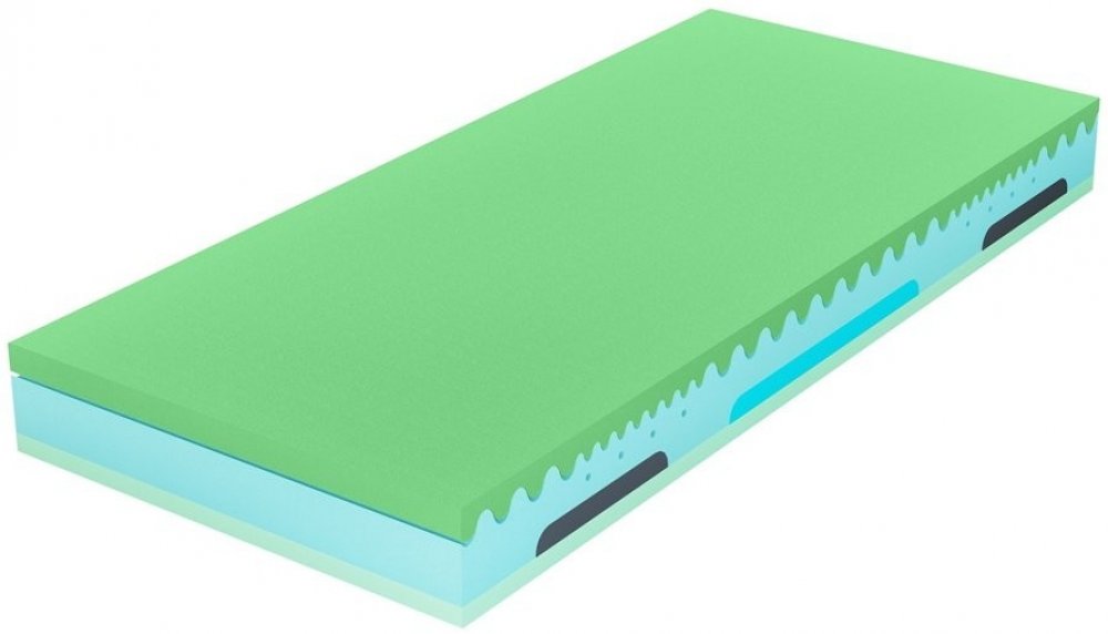 Citlivé výztuhy v oblasti pánve a ramen. Ramenní zóny upravují tuhost, Což oceníte Zejména při spánku na boku. V oblasti pánve je odolná studená pěna velmi vysoké objemové hmotnosti, která je především šetrná ke kyčelní kloubům.