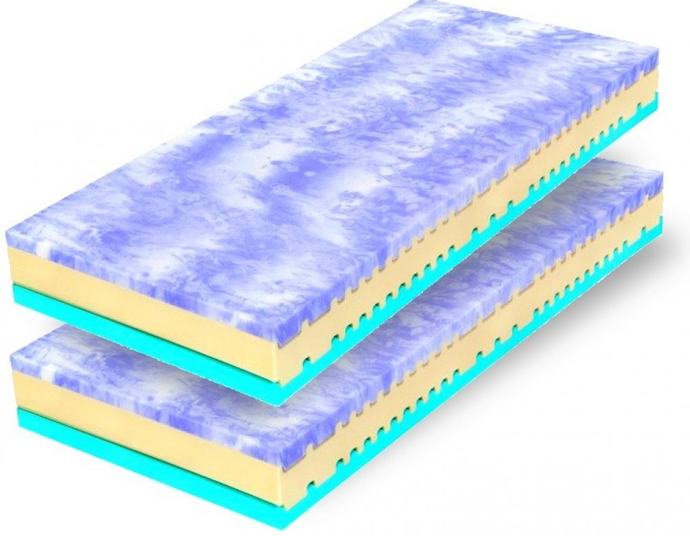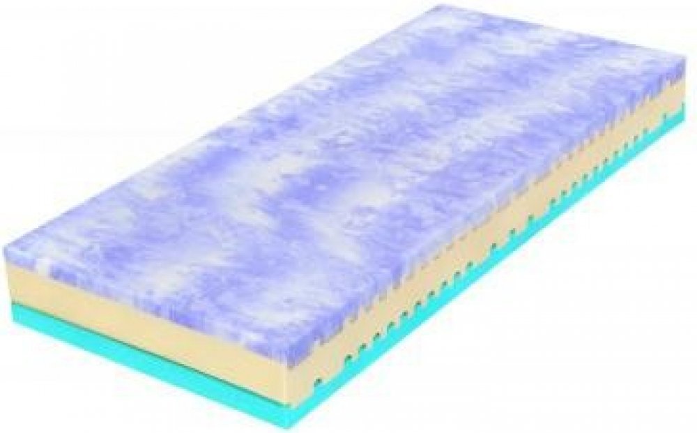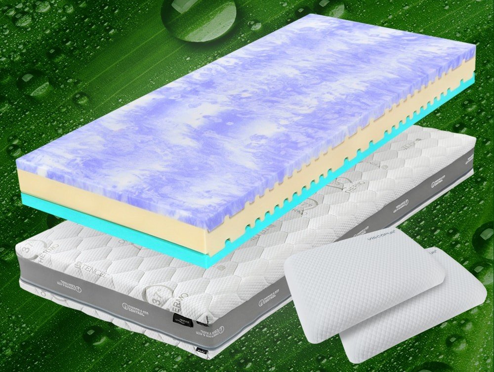 Nelepené jádro s provětrávacími kanálky pro maximální hygienu a omezení pocení. Super pružná a tuhá strana (zelená) a super jemná a kopírující hybridní pěna na měkčí straně.