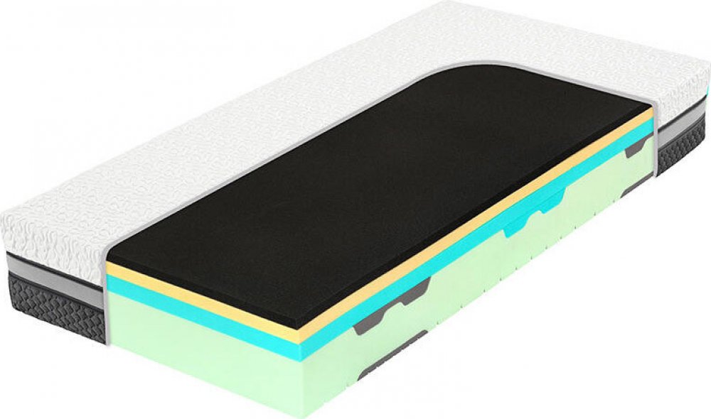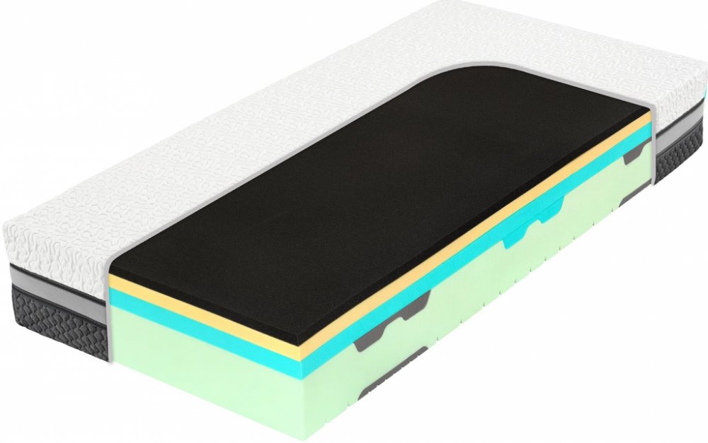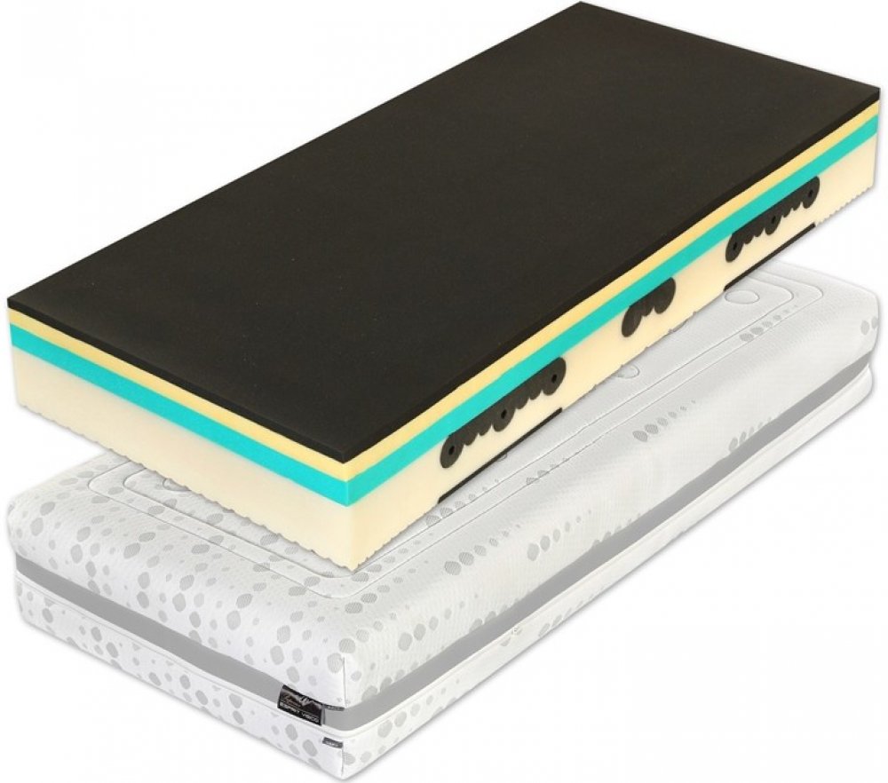 Hybridní pěna 50 kg/m3 (9/12/17 cm) spojuje výhody studené pěny (vzdušnost, pružnost), latexu (termoregulace, nezničitelnost) a visco pěny (přizpůsobivost).
