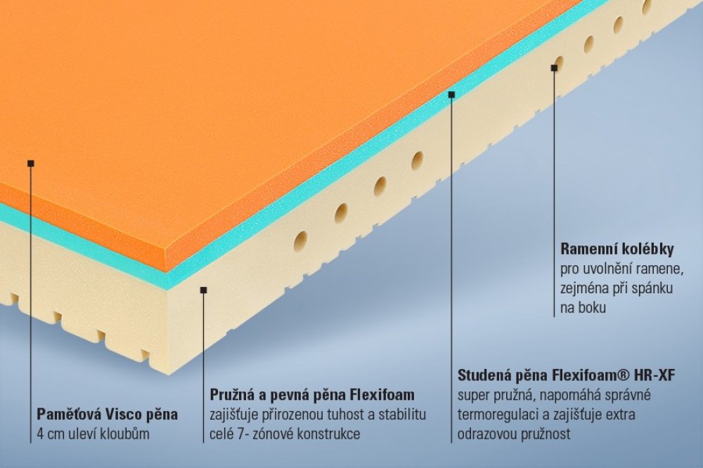 - Studená pěna Flexifoam® HR-XF - super pružná studená pěna napomáhá správné termoregulaci a zajišťuje extra odrazovou pružnost. To znamená, že se při spánku budete snadno otáčet.