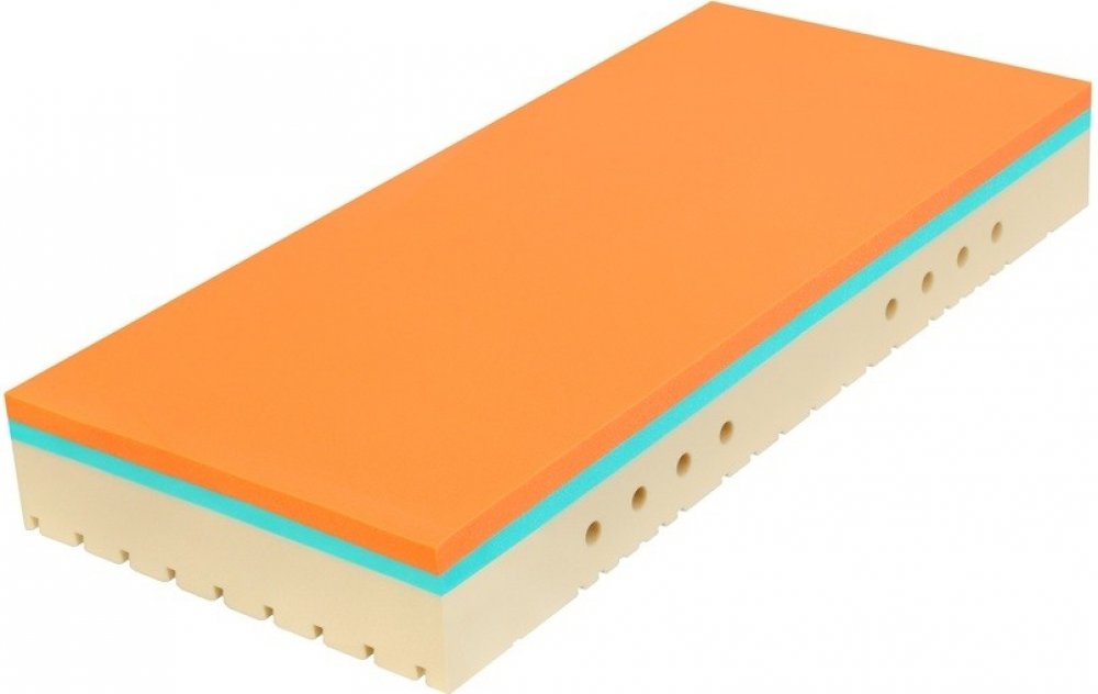 Paměťová (visco) pěna (oranžová vrstva) - vyrobena za použití přírodních surovin; lepší elasticita a antialergické vlastnosti. Super pohodlná, uleví kloubům.