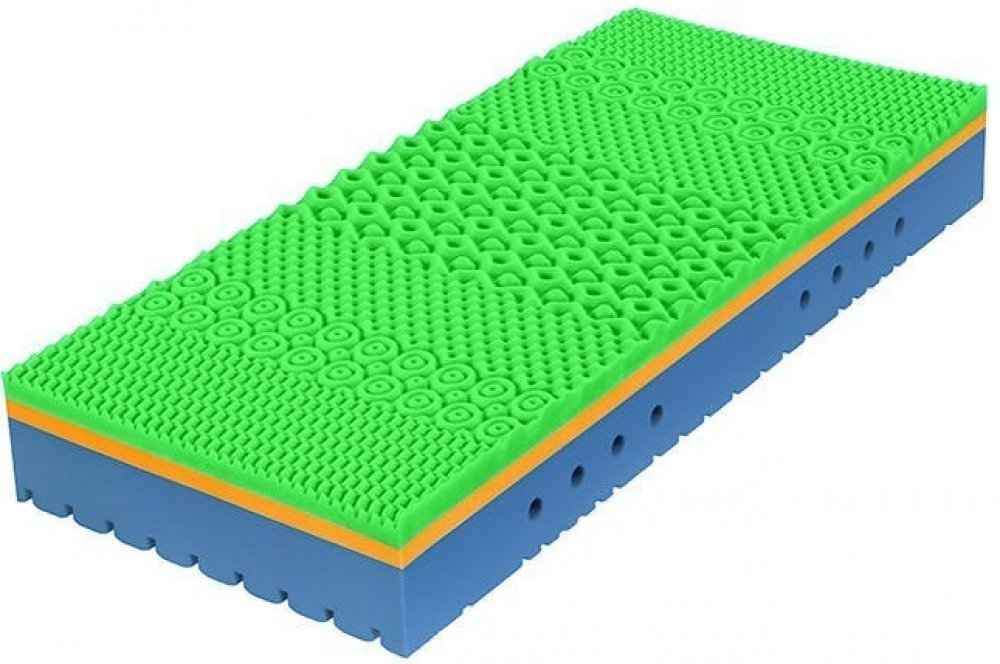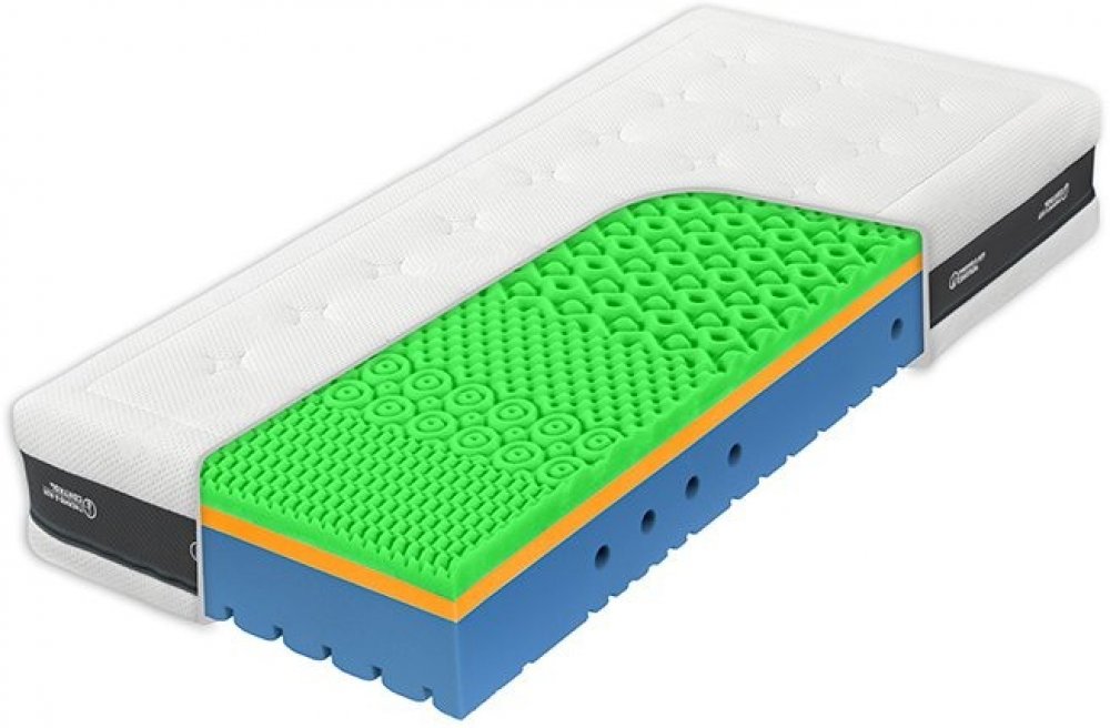 Tužší, pružná hybridní pěna s antidekubitní profilací = skvěle dýchá, a i přes vyšší tuhost netlačí.