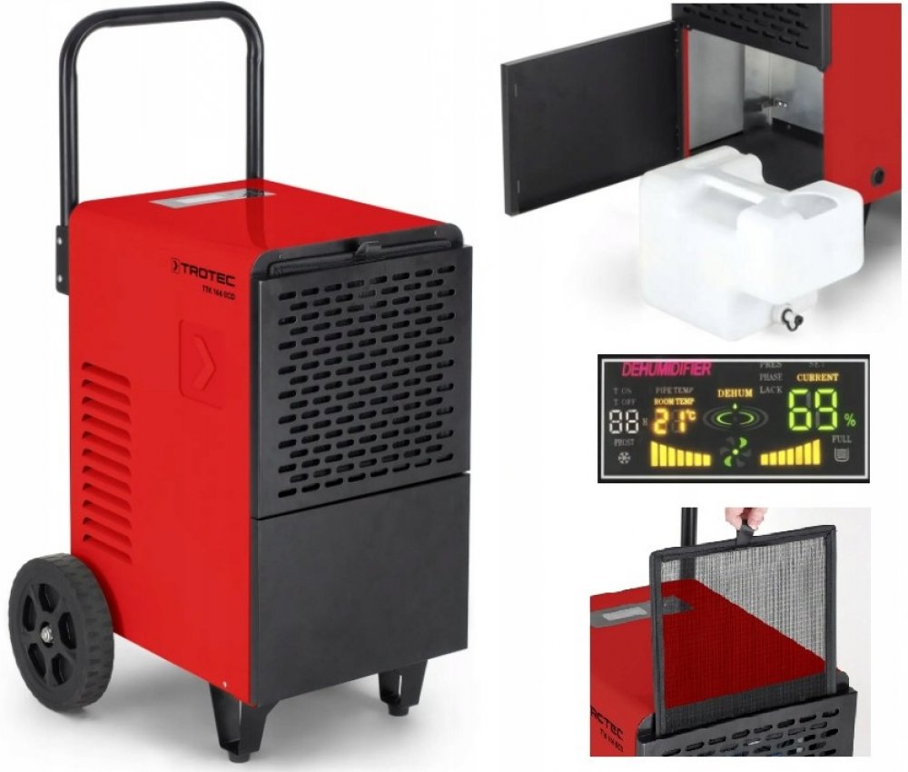 Výhody pro praxi: Obzvláště ekonomické řešení pro typické aplikace odvlhčování v komerčním sektoru Kvalita testována GS Vysoký výkon odvlhčování Robustní ocelová konstrukce v designu vozíku Díky kompresoru s rotačním pístem lze přepravovat a skladovat v jakékoliv poloze Automatické ovládání ovládané hygrostatem funkce časovače Zobrazení aktuální vlhkosti místnosti a aktuální teploty místnosti v pohotovostním režimu, jakož i během odvlhčování