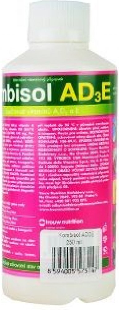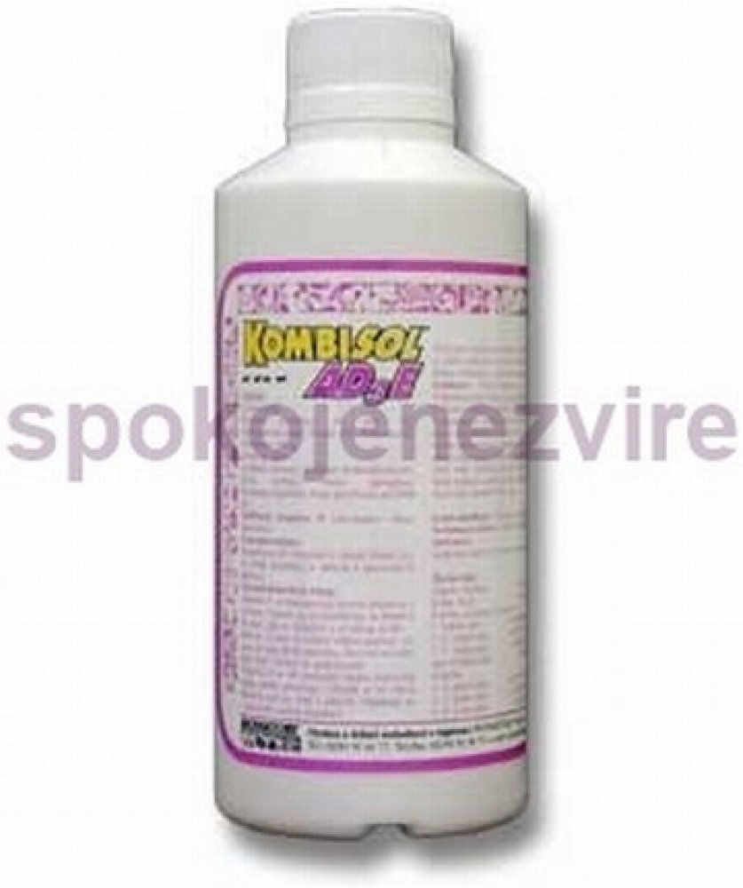 Kombisol® AD3E sol.Komplex vitamínov A, D3, E v tekutej forme.Zloženie: Vitamín A, vitamín D3, vitamín E.Dávkovanie: nosnice, kačice 1 ml/50 ks/deň. Morky, husi 1 ml/30 ks/deň. Kurčatá, káčatá, húsatá 1. týždeň veku 1 ml/180 - 200 ks/deň, 2.-3. týždeň veku 1 ml/100 - 150 ks/deň, 4.-6. týždeň veku 1 ml/80 - 100 ks/deň, nad 6 týždňov veku 1 ml/50 ks/deň. Odchov a výkrm moriek 1.-2. týždeň veku 1 ml/120 - 150 ks/deň, 3.-5. týždeň veku 1 ml/80 - 120 ks/deň, 6.-9. týždeň veku 1 ml/60 - 80 ks/deň, nad 10 týždňov veku 1 ml/40 - 60 ks/deň. Teľatá, žriebätá (50 kg ž. hm.) 1 ml/8 ks/deň. Prasiatka, jahňatá, kozľatá (5 kg ž. hm.) 1 ml/40 ks/deň. Ošípané (100 kg ž. hm.) 1 ml/4 ks/deň. Kone, dobytok (500 kg ž. hm.) 1 ml/1 ks/deň.Indikácia: podpora nešpecifických imunitných procesov, zvýšená vitalita mláďat, v období zvýšenej fyziologickej záťaže organizmu, v období reprodukcie, maximálnej úžitkovosti, poruchy osifikácie a rastu kostí, v strese, pri transporte, vakcinácii a pri zníženom príjme krmiva v dôsledku dietetických porúch alebo infekčných ochorení. U chovnej hydiny pri zníženej intenzite znášky, zníženej oplodnenosti a liahnivosti násadových vajec, zníženej kvalite vaječnej škrupiny a nízkej biologickej hodnote násadových vajec a pri výskyte hypovitaminóz A, D, E.Kontraindikácia: súčasné podávanie vitamínu D2 je neprípustné.Spôsob použitia: Kombisol AD3E sa podáva zvieratám rozriedený v pitnej vode alebo v mlieku. Preventívne po dobu 5 - 10 dní v uvedených dávkach. Aplikáciu je možné opakovať . Pri liečebnom podávaní je možné dávkovanie zvýšiť podľa doporučenia veterinárneho lekára.Poznámka: rozriedený roztok je nutné chrániť pred priamym slnečným svetlom a čo najrýchlejšie ho spotrebovať.Ochranná doba: bez ochrannej doby.Doba použiteľnosti: 18 mesiacov od dátumu výroby.Spôsob skladovania: pri teplote 10 - 25 °C, v tme. Chrániť pred svetlom a mrazom.Balenie: 30 ml, 250 ml, 1 l - plastové obaly.