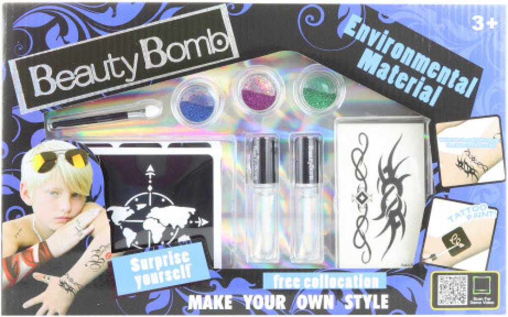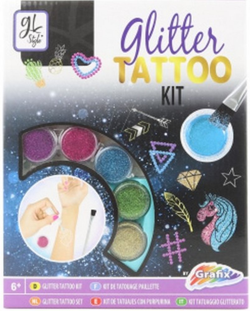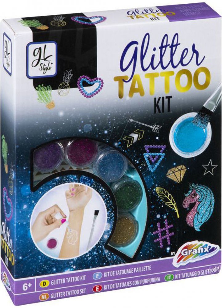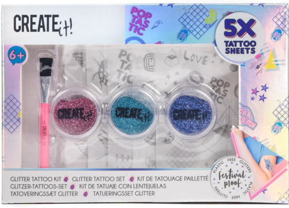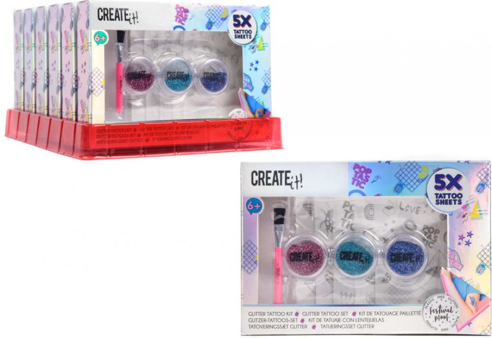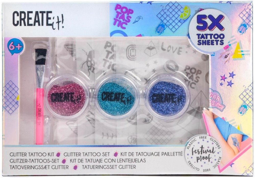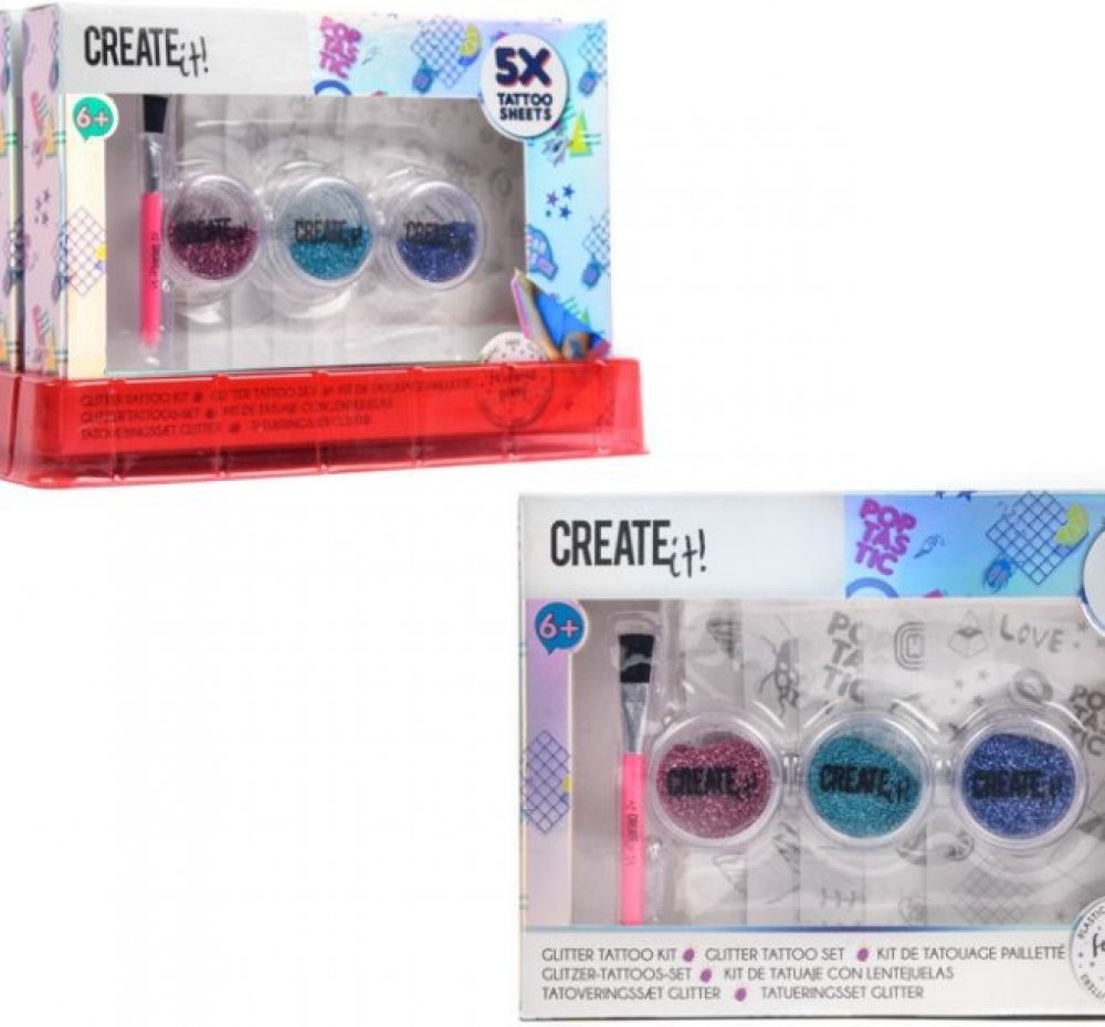 BonaDream - Vaše sny se stanou skutečností. Ozdobte svoje telo cool trblietavým tetovaním Canenco Create It! Vytvoríte ich pomocou šablóny. Šablóny si priložte k pokožke, potom už len štetcom naneste trblietavý prášok na lepidlo, nechajte minútku zaschnúť a hotovo. Tetovania sú cool a ak vás omrzia, stačí ich umyť vodou. Obsahuje: 3 tégliky s trblietkami, šablóny, malý štetec.