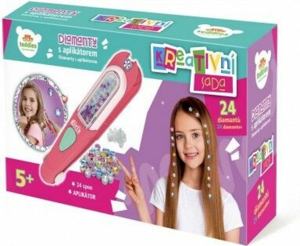 Kreativní sada 24 diamantů a 24 spon s aplikátorem. Diamant vložte do vrchní části aplikátoru. Do spodní části vložte přezku. Do přezky ve spodní části vložte slabý pramen vlasů a umístěte ho tam, kde chcete diamant připevnit. Zmáčkněte aplikátor, abyste diamant na vlasech zafixovali přezkou. Drahokam zůstane na pramenu vlasů připevněný.
