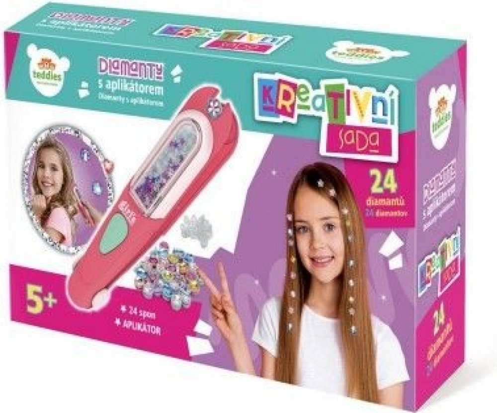 Kreativní sada 24 diamantů a 24 spon s aplikátorem. Diamant vložte do vrchní části aplikátoru. Do spodní části vložte přezku. Do přezky ve spodní části vložte slabý pramen vlasů a umístěte ho tam, kde chcete diamant připevnit. Zmáčkněte aplikátor, abyste diamant na vlasech zafixovali přezkou. Drahokam zůstane na pramenu vlasů připevněný.