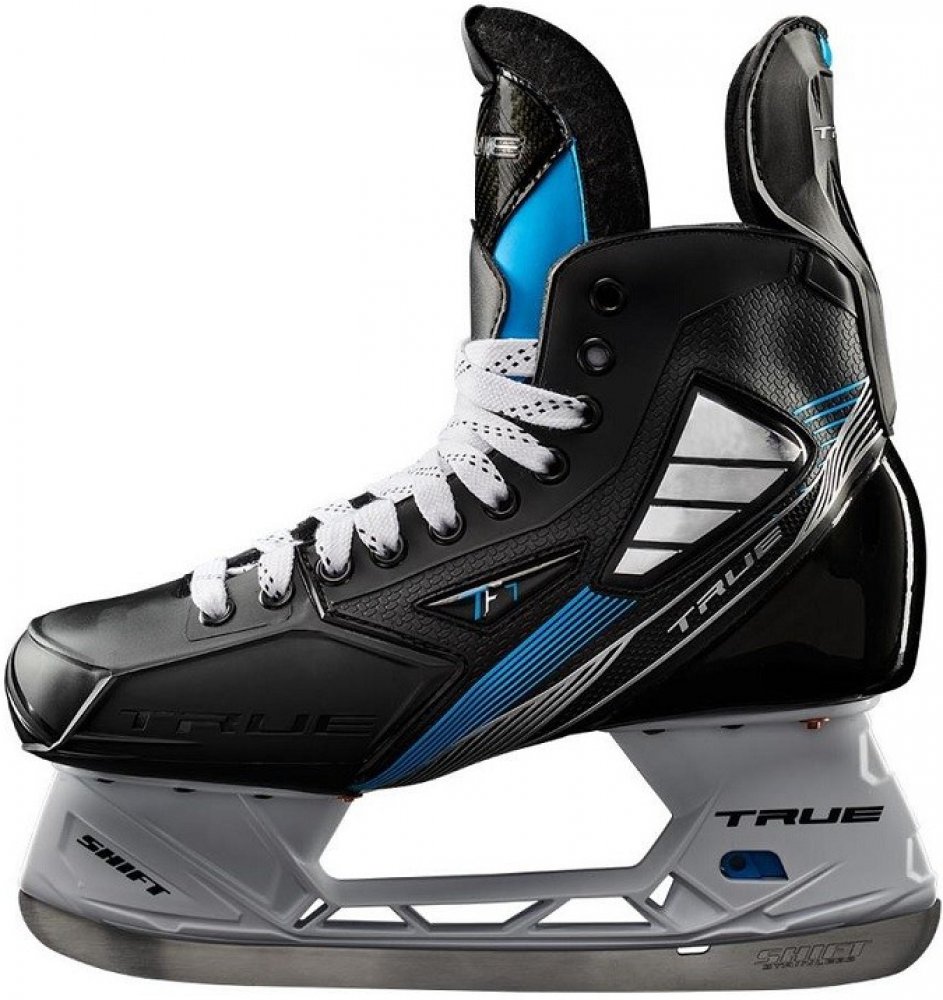 Brusle True TF7 nabízí vysokou kvalitu a spoustu stejných prvků, kterou lze nalézt i u nejvyšší řady, která se vyrábí na míru. Brusle True TF7 nabízí vysokou kvalitu a spoustu stejných prvků, kterou lze nalézt i u nejvyšší řady, která se vyrábí na míru. Tepelně tvarovatelná jednodílná skořepina ze skelných vláken poskytuje nejlepší přizpůsobení ve své třídě a zároveň poskytuje bezkonkurenční výkon na ledě. TF7 je také vybaven všestranným holderem SHIFT pro rychlou výměnu čepele a usnadňuje přenášení více párů oceli na kluziště. Kotva tabulky velikostí Samotná bota je vyvrcholením tisíců skenování chodidel a stovek hodin vývoje ze strany hráčů a inženýrů, aby se co nejvíce přiblížily přizpůsobení bruslí na míru. Skořepina využívá technologii TRUESHELL, patentovanou jednodílnou skořepinu ze skelných vláken, která vytváří tepelně tvarovanou botu a dává jí nejlepší střih ve své třídě. Anatomický plstěný jazyk vytváří tuhý, tvarovaný design. Tento tradiční pocit a střih umožňuje jazyku poskytnout zvýšené pohodlí pro každého bruslaře. Uvnitř brusle je antimikrobiální vložka blackwick po vnitřku celé boty. Pomáhá udržet nohy v suchu a poskytuje větší pohodlí. Brusle obsahují i personalizovaný fit systém se stélkou TF7. Tato stélka integruje fit vložky pro přizpůsobení nízké, střední a vysoké klenbě chodidel. Holdery SHIFT jsou vybaveny vylepšenou technologií BenchChange umožňující rychlejší výměnu nože bez potřeby speciálního nástroje. Bonusem navíc je, že holdery na rozdíl od jiných značek nemají levou a pravou nohu, takže výměna je mnohem jednodušší. Nože jsou z husté, odolné kvalitní nerezové oceli, která drží hrany ostré po dlouhou dobu.