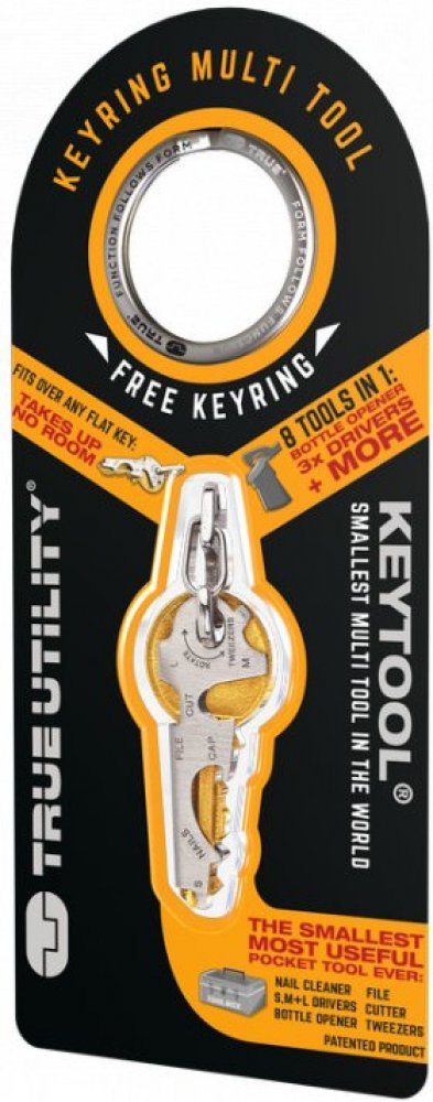Stylový nástroj na klíči Stylový nástroj na klíči, využívající jej pro zvětšení síly páky pro otvírač lahví, pro 3 různé velikosti šroubováku, včetně šroubováku na brýle. Funkce - Otvírač lahví - Šroubovák na brýle - Střední šroubovák - Velký šroubovák - Pilník na nehty - Čistič nehtů - Stříhač nití - Pinzeta