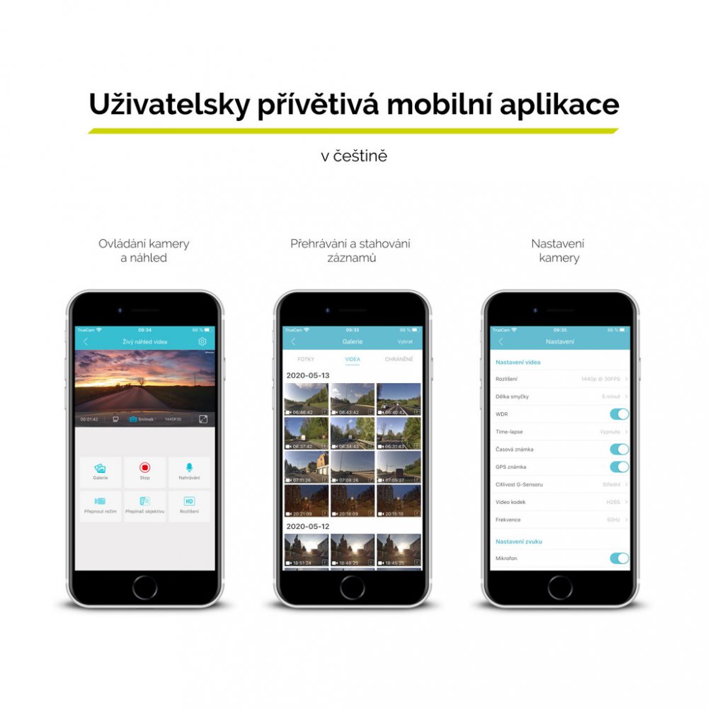 TrueCam H7 nemá displej a tak se ovládá primárně přes vyladěnou mobilní aplikaci. Ta je v češtině a veškeré nastavení zvládnete raz dva. Stejně snadno si přetáhnete pořízená videa – kamera v sobě má výkonnou 5 GHz WiFi, takže přenos dat je 5 krát rychlejší než u běžné 2.4 GHz WiFi.