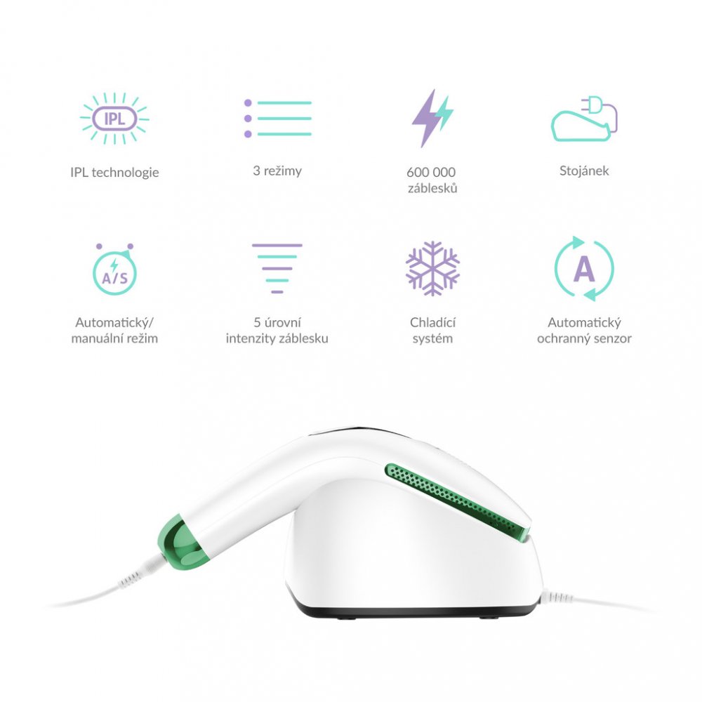 Epilátor TrueLife BELLE IPL E5 využijete kromě samotné epilace i k dalším aplikacím. Stačí pouze vyměnit lampu. K dlouhodobému a účinnému odstranění chloupků vám poslouží HR lampa, Nejednoho člověka trápí akné. Pokud chce mít obličej čistý a hebký na dotek, doporučujeme použít AC lampu. Pokud chcete svoji pokožku omladit, pomůže vám s tím SR lampa. Všechny lampy jsou součástí balení. Nemusíte si tedy nic dokupovat. Určitě oceníte i praktický stojánek.