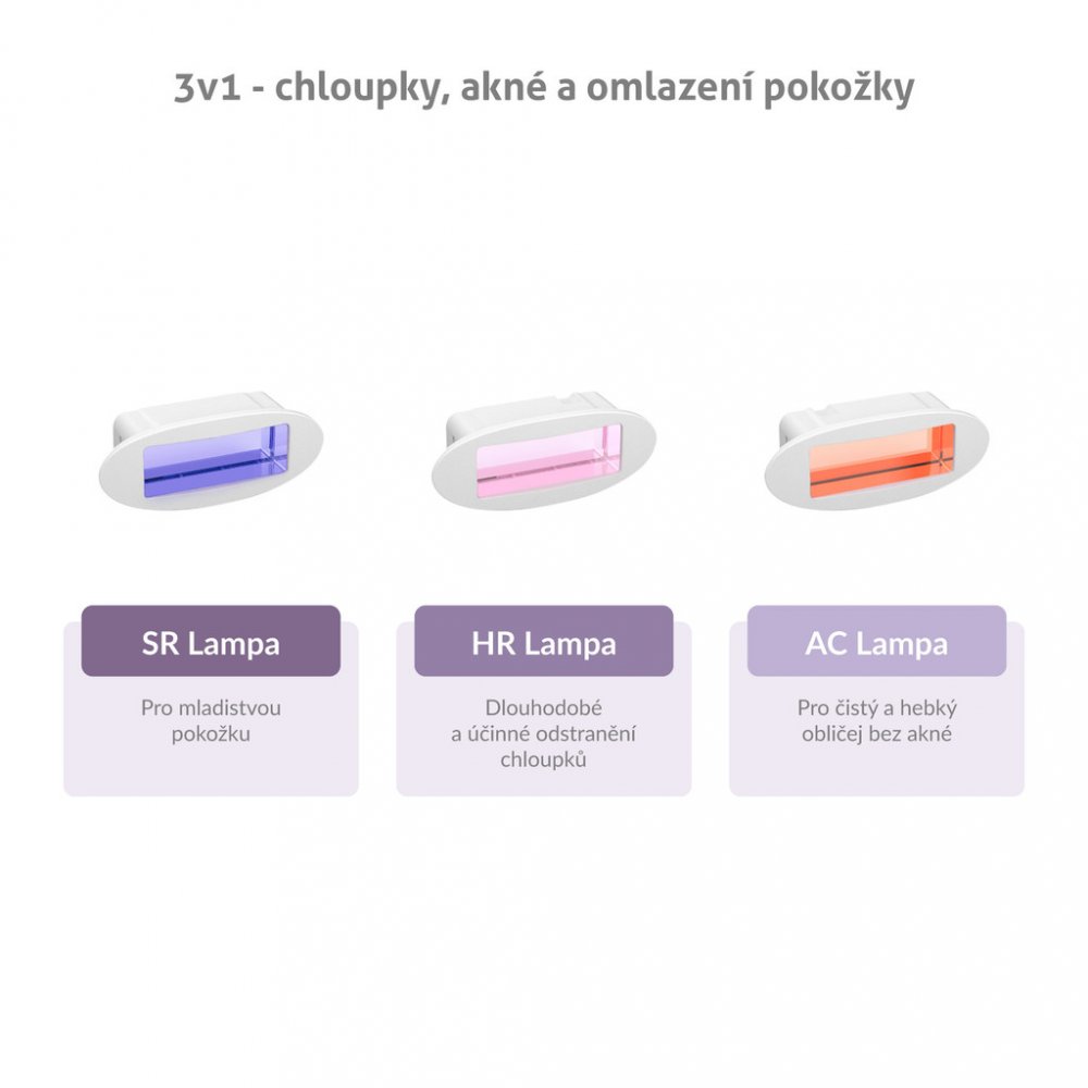 3 - HR lampa - odstranění chloupků,AC lampa - proti akné,SR lampa - omlazení pokožky