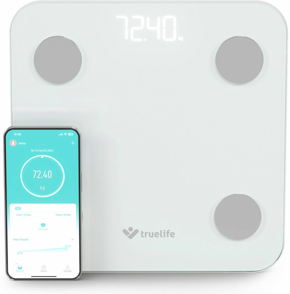 Osobní váha TrueLife FitScale W1 BT WhiteDetailní pohled na vaše těloTrueLife FitScale W1 BT White rozpozná všechny detaily vašeho těla a poskytne vám detailní přehled celkem 20 tělesných indexů včetně jejich popisu. Osobní váha má tvrzené krycí sklo, díky kterému má nosnost až 180 kg. Vysoce přesné senzory zajistí vážení s přesností vážení na 100 gramů. Na displeji se vám ihned zobrazí hmotnost. ...