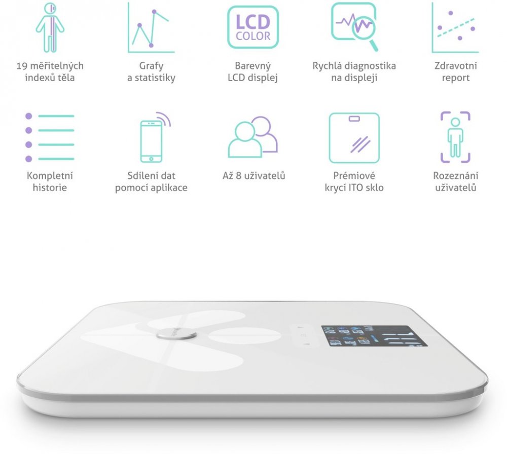 Váha disponuje prémiové krycí ITO sklo, které mnohem lépe vodí a jeho senzory jsou citlivější. Uživatel tedy nemusí stát přesně na elektrodách.