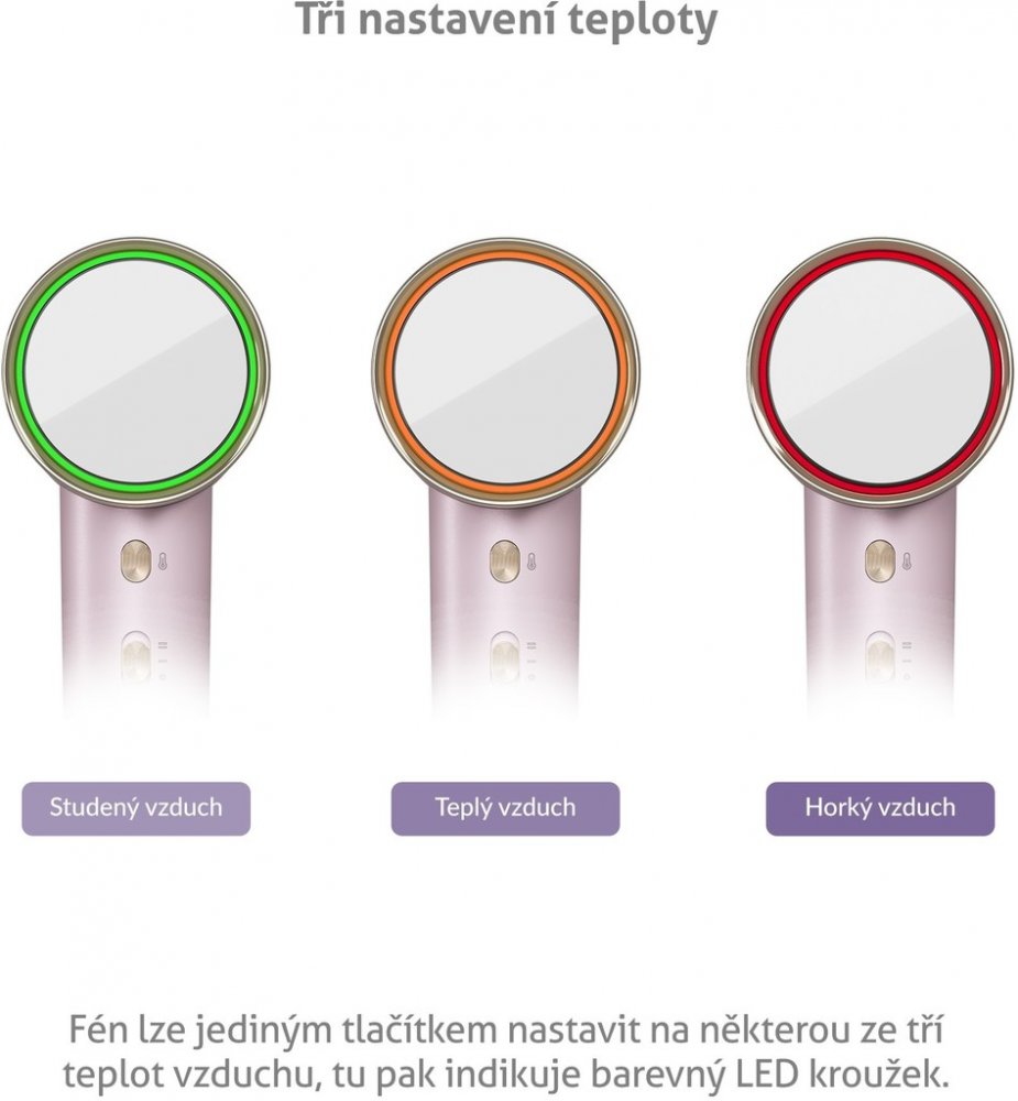 Technologie TrueLife ConstantHeat® spolehlivě udržuje konstantní teplotu po celou dobu sušení. Vlasy se tak zbytečně nepoškozují, jsou hebké a lesklé. Vybrat si můžete ze 3 teplotních stupňů. Aktuální nastavení teploty indikuje barevný LED kroužek okolo zrcadlové plochy. Zelená barva signalizuje studený vzduch, teplý vzduch barva oranžová a a střídavý žlutá.