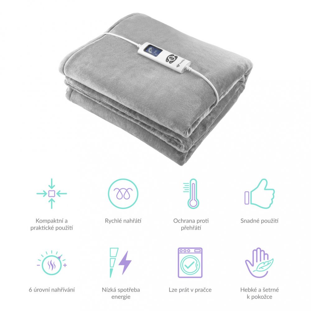 Nahřívací deka, 180 x 130 cm, 6 stupňů teplot, prémiový mikrofleece, automatické vypnutí, dlouhý kabel 3,5 m, rychlé a rovnoměrné nahřívání, časovač 1-12 hodin, nízká spotřeba, vhodná jako podložka na matraci, peřina i přikrývka, vysoká skladnost, vhodná na cesty, jednoduchá obsluha, pratelná i v pračce, pomáhá v boji s bolestí zad a svalů.