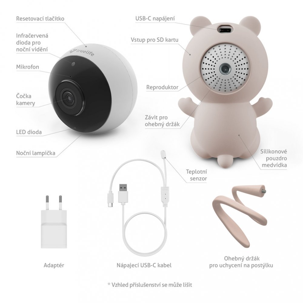 VGA (640×360 15fps) Max. kapacita microSD karty 128 GB Vstup napájení USB-C (potřebné adaptéry a kabely v balení) Spotřeba energie 5 V, 1 A Rozměry 65 × 80 × 120 mm (d × š × v) Hmotnost 170 g Další funkce Neomezený dosah díky online Wi-Fi zobrazení, aplikace TrueLife Smart v češtině, ukolébavky, automatické noční vidění, obousměrná komunikace, detekce na pohyb, zvuk a teplotu (oznámení v telefonu), pořízení fotografií a videí (uloží se do galerie pořízených záznamů), nepřetržité nahrávání videa 24/7 na microSD kartu, nastavení kvality přenosu videa (SD/HD), přiblížení obrazu, nastavení hlasitosti, noční lampička, silikonové pouzdro, závit pro uchycení držáku v balení, sdílení účtu s více členy domácnosti, zabezpečení proti hacknutí s pětivrstvou bezpečnostní technologií, možnost cloudového uložiště