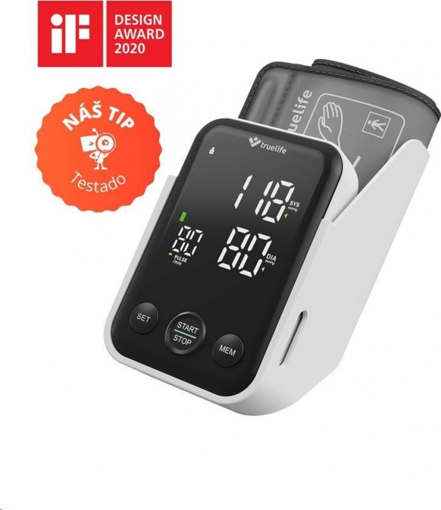 TrueLife Pulse B-Vision – Digitální tlakoměr se stojánkemTrueLife Pulse B-Vision – Digitální tlakoměr se stojánkemVáš domácí lékařVýkonný tlakoměr v prestižním designu. TrueLife Pulse B-Vision pomůže hlídat krevní tlak, uchovávat data z měření i dvou uživatelů, a navíc se stane skvělým doplňkem každé místnosti. V paměti uchová až 120 měření každého uživatele. Tlakoměr disponuje jedinečným, kontrastním LED displejem, na který je dobře vidět i ve tmě. K ovládání slouží 3 přehledná tlačítka. Tlakoměr i manžetu snadno uložíte do praktického stojánku, který je součástí balení. Funkce zvukového doprovodu umožňuje předčítání naměřených hodnot. Výhodou je i indikátor nepravidelného srdečního rytmu. Tlakoměr je napájen třemi bateriemi a lze s ním bez problému cestovat.Hlídá vaše zdravíTlakoměr Truelife Pulse využívá oscilometrickou metodu měření tlaku, která zajišťuje maximální přesnost naměřených hodnot. Tlakoměr mohou využít dva uživatelé. Potřebujete-li si hodnoty tlaku hlídat a zaznamenávat, potěší vás paměť až na 120 měření pro každého uživatele. Indikátor nepravidelného srdečního rytmu hlídá váš puls. Výhodou je zvukový doprovod, který umožňuje předčítání naměřených hodnot.Jedinečný a praktický designTlakoměr TrueLife Pulse B-Vision je bezesporu jedinečný svým designem, o čemž svědčí i prestižní ocenění Design Award. LED displej, který slouží k zobrazení naměřených hodnot je dostatečně velký a díky černo-bílému kontrastnímu provedení i velmi přehledný. Součástí balení je praktický stojánek, do kterého snadno uložíte tlakoměr i manžetu.Snadné ovládání i manipulaceTlakoměr je ideální i k používání mimo domov a na cestách, k jeho používání nepotřebujete zdroj napájení, jeho chod zajišťují alkalické baterie. Jeho ovládání je velmi jednoduché, vše podstatné zvládnete pomocí tří tlačítek.LED displejDisplej, který slouží k zobrazení naměřených hodnot je dostatečně velký a díky černo-bílému kontrastnímu provedení velmi přehledný i ve tmě.Kompaktní a praktický stojánekSoučástí balení je praktický stojánek, do kterého snadno uložíte tlakoměr i manžetu.Automatické ovládáníNa tlakoměru nemusíte nic nastavovat. Stačí zmáčknout jedno tlačítko a tlakoměr se o zbytek postará.Indikátor nepravidelného srdečního rytmuPomocí indikátoru tlakoměr hlídá hodnoty vašeho srdečního pulsu, na jehož nepravidelnost vás upozorní signalizací.Indikátor pohybuV případě, že se během měření pohnete, tlakoměr vás upozorní, abyste provedli nové měření.Přesné měřeníOscilometrická metoda vám zajistí rychlé a maximálně přesné měření.Paměť na 2× 120 měřeníTlakoměr mohou využívat dva uživatelé, pamatuje si 120 předchozích měření každého z nich. Hodnoty krevního tlaku tak můžete dlouhodobě sledovat.Barevná škála WHOPři každém měření jsou vaše výsledky seřazeny podle systému WHO (Světová zdravotnická organizace) na barevné stupnici. To umožňuje jednoduché a jednoznačné posouzení vašeho krevního tlaku.?Zobrazení průměrné hodnotyTlakoměr vám dopočítává a zobrazuje průměrnou hodnotu z posledních třech měření.Univerzální velikost manžetyManžetu tlakoměru lze nastavit na 22-42 cm, velikost tak sedne každému.Zvukový doprovodVýhodou tlakoměru je funkce zvukového doprovodu, která vás provede celým měřením a naměřené hodnoty vám přečte.Automatické vypnutíPokud zapomenete po měření tlakoměr vypnout, nemusíte se obávat, že by se vybily baterie. Tlakoměr se po chvilce sám vypne.Vhodný i na cestyDíky kompaktním rozměrům je tlakoměr lehce přenosný. Zároveň díky provozu na baterie nemusíte řešit případné nabíjení tlakoměru.Dvě možnosti provozuTlakoměr je možné používat s bateriemi anebo využít napájení skrze univerzální USB-C port.Klinická certifikace přesnosti WHOTlakoměr byl pečlivě testován a ověřen Světovou zdravotnickou organizací (WHO) a splňuje globální klinické standardy a protokoly.Parametry TrueLife Pulse B-VisionTypNa pažiMetoda měřeníOscilometrickáVelikost manžety22-42 cmDélka hadičky manžety70 cmPaměť2× 120 výsledků měřeníIndikátor vysoké krevního tlakuAno – barevné znázorněníFunkcePrůměrování, indikátor nepravidelného srdečního rytmu, automatické vypnutí, indikátor pohybu, barevné znázornění tlaku, hlasová asistencePřipojeníNeDisplejLEDVelikost displeje62,5 × 63,5 mmRozsah měření tlaku40-230 mmHgRozsah měření pulzu40-170 tepů/minPřesnost měření tlaku± 3 mmHgPřesnost měření pulzu± 5 %Napájení3×1.5 V AA baterie / 100-240 VRozměry123 × 82 × 25 mmHmotnost505 gCertifikovaný zdravotnický prostředekANOPříslušenstvínapájecí adaptér (není součástí balení)Obsah balení1× Tlakomeˇr1× Pazˇni´ manzˇeta1× Stojan na tlakomeˇr3× Alkalicka´ baterie AA 1,5 V1× Manua´l1× Bezpecˇnostni´ instrukce