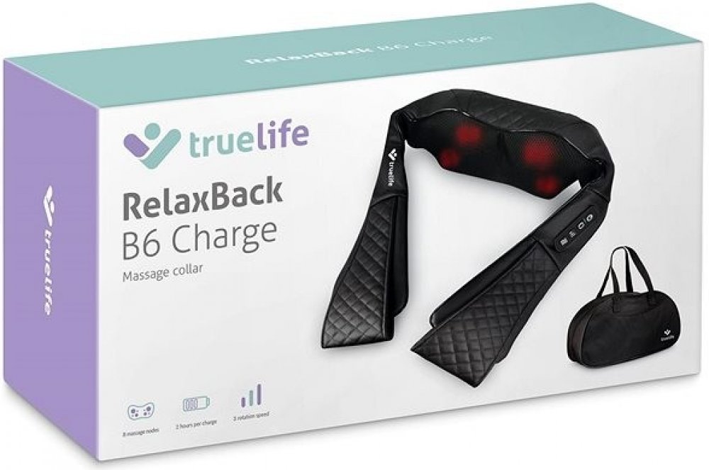Uspěchaná doba, hektický životní styl a často sedavá zaměstnání našemu zdraví nepřidávají. Proto se nesmíme zapomínat i trochu hýčkat. Právě pro tyto okamžiky přichází na scénu TrueLife RelaxBack B6 Charge, masážní přístroj, jenž napomáhá zmírňovat bolesti zad a šíje, regenerovat svaly a uvolňovat napětí a stres. Přístroj disponuje vyhříváním, které lze využít jako tepelnou terapii pro zklidnění bolavých svalů a zlepšení krevního oběhu. Masážní hlavy mají 3 úrovně rychlosti otáčení. Dvě rotační hlavice se čtyřmi nahřívacími hloubkovými masážními uzly poskytují pocit jako při masáži Shiatsu. Přístroj lze díky jeho ergonomickému designu ve tvaru U použít pro masáž celého těla, k čemuž přispívají také 3D rotační hnětací masážní uzly. Speciální držáky na ruce umožňují více stáhnout masírované místo pro větší účinnost. Časovač je nastaven na 15 minut masáže, přičemž každou minutu automaticky dochází ke změně směru otáčení. Přístroj má vestavěnou baterii s výdrží až 2 hodiny na jedno nabití, takže jej bez problémů lze používat i v autě. Jeho provoz je tichý a údržba snadná, stačí otřít hadříkem. Praktická je též cestovní taška.