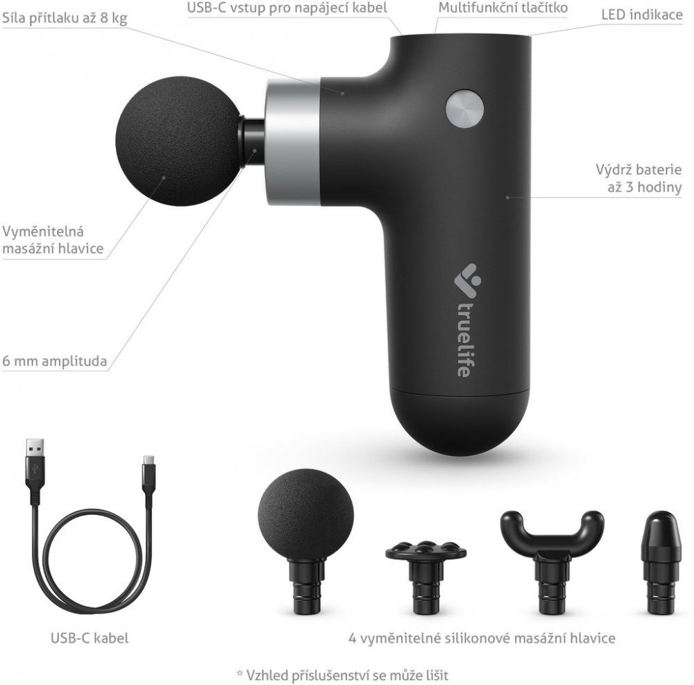 Obsah balení: 1× TrueLife RelaxGun G3, 4× masážní hlavice, 1× USB-C kabel, 1× uživatelský manuál