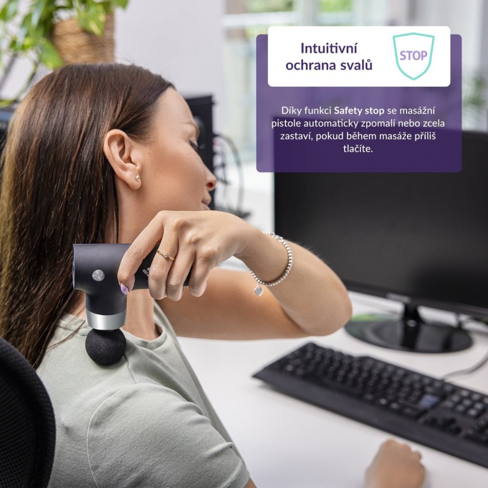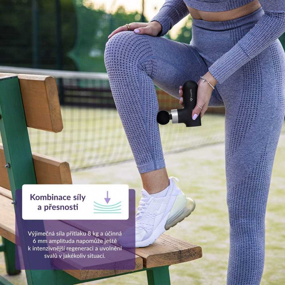 Jste aktivní sportovci nebo máte sedavé zaměstnání a chcete ulevit ztuhlé či namožené svaly? Masážní pistole TrueLife RelaxGun G3 je přesně proto určená. V pohodlí domova si můžete namasírovat požadované svalové partie a napomoct tak regeneraci svalů, zlepšit průtok krve či zmírnit křeče. Vybrat si můžete celkem ze 4 vyměnitelných hlavic a zvolit si ze 4 intenzit masáže. Kompaktní a lehké provedení pohodlně sedí v ruce. I přesto dokáže masážní pistole TrueLife RelaxGun G3 vyvinout přítlak o hodnotě až 8 kg, amplitudou 6 mm a s frekvencí pohybu až 2850 kmitů za minutu. Pokud budete na masážní pistoli příliš tlačit, dojde k jejímu zpomalení či úplnému vypnutí díky funkci Safety stop. Po 15 minutách masírování se TrueLife RelaxGun G3 automaticky vypne.