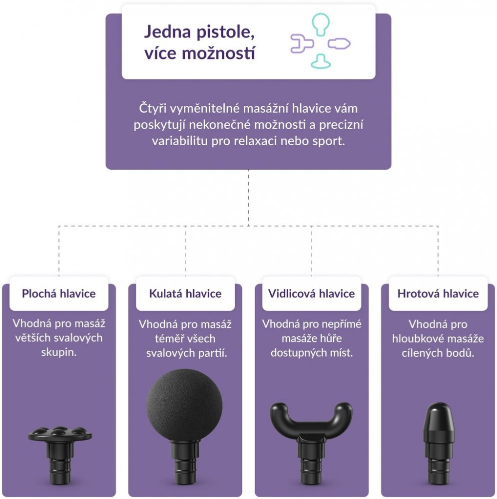 Součástí balení jsou 4 masážní hlavice (flat head, bullet head, fork head a ball head)