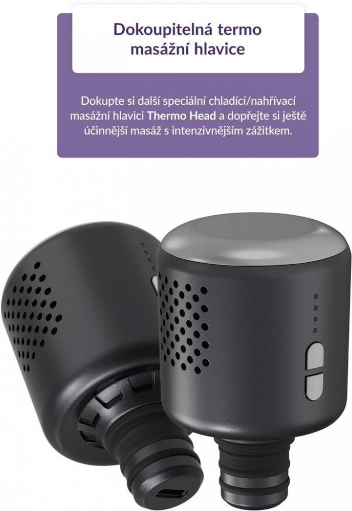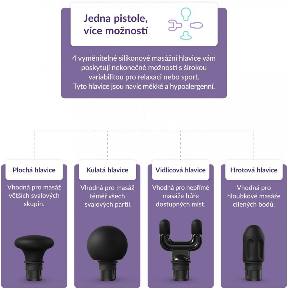 RelaxGun G6 Metal disponuje hned 4 vyměnitelnými silikonovými hlavicemi, určenými na různé části těla a pro široké využití. Měkké, silikonové a hypoalergenní provedení je oproti tomu běžnému plastovému šetrné k pokožce, odolné a dobře se udržuje. Pro masáž větších svalových skupin se hodí plochá hlavice Flat Head, jejíž tlak je jemnější, což oceníte například v blízkosti kostí. Obtížně dostupná místa jako trapézy či achillovu šlachu promasíruje hlavice Fork Head, která se snadno přizpůsobí konturám těla. Téměř pro všechny svalové partie se hodí kulatá hlavice Ball Head, jež se tělu dokonale přizpůsobí. Pro cílenou masáž konkrétních bodů na těle, tzv. trigger pointů, je určena hrotová hlavice Bullet Head.