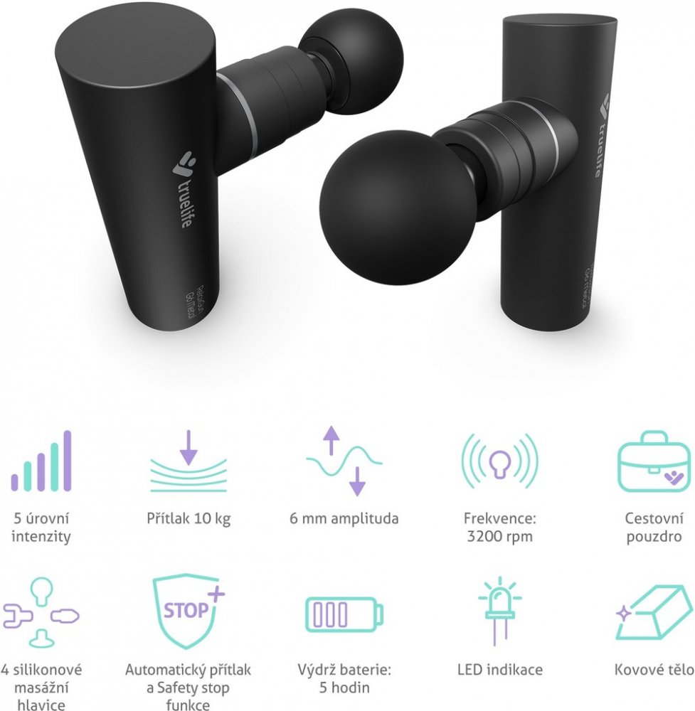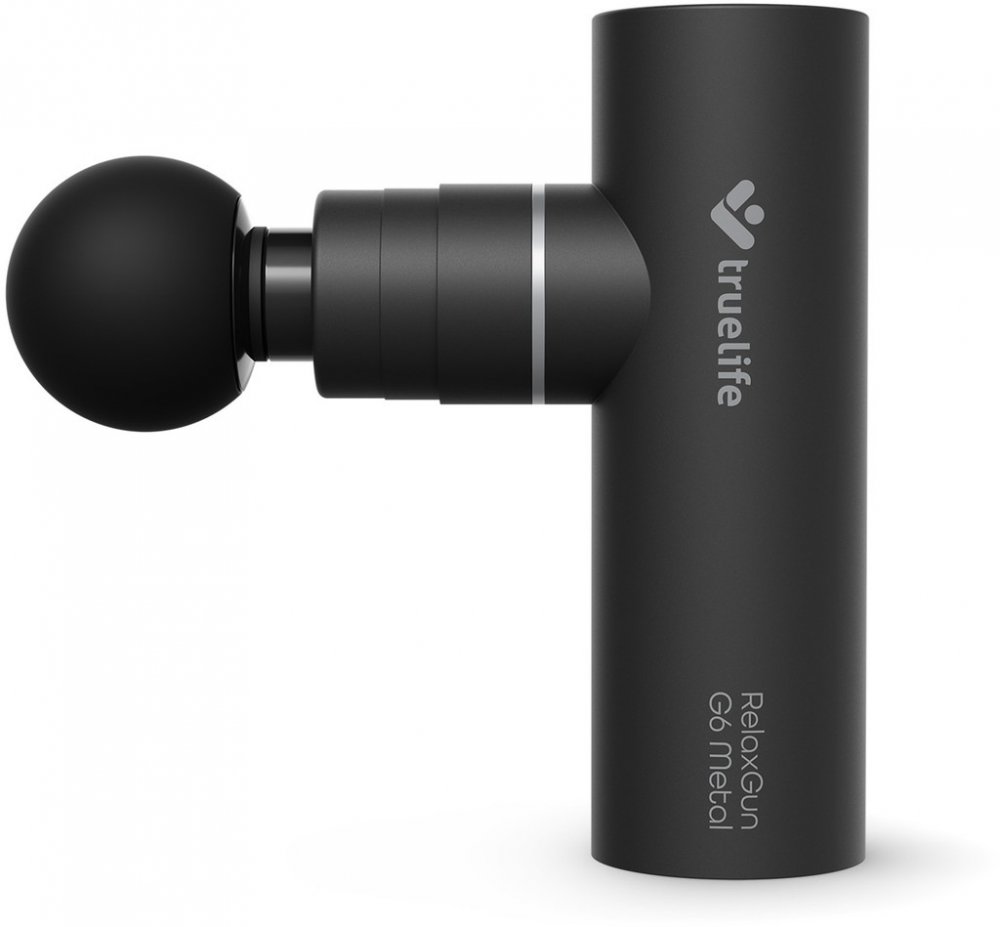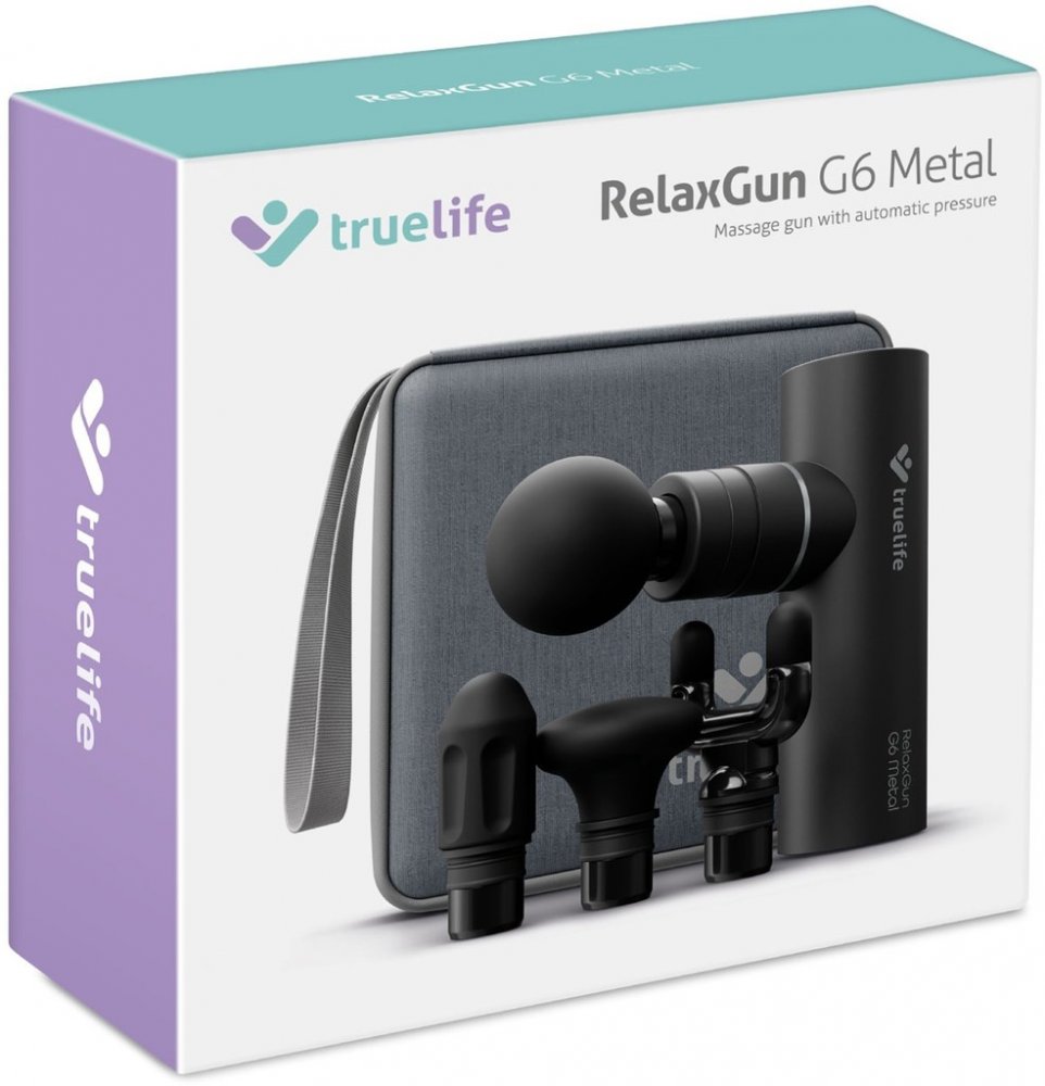 Příjemná masáž pro sport i sedavé zaměstnání, která napomůže od bolesti a ztuhlosti svalů, se občas hodí každému. Ne vždy je ale možnost zajít k masérovi, proto TrueLife přináší jednoho až k vám domů. Masážní pistole RelaxGun G6 Metal je vždy připravena se o vás postarat. Jejích 5 intenzit napomůže regeneraci svalů, zmírnění napětí, zlepšení krevního oběhu a uleví od stresu. Pistole téměř nic díky své malé velikosti neváží, snadno se s ní tedy manipuluje, avšak ukrývá velký výkon – sílu přítlaku 10 kg. Amplituda činí 6 mm a přístroj vykoná až 3200 kmitů za minutu. K dispozici jsou 4 vyměnitelné silikonové hlavice a šikovné bezpečnostní funkce Automatic pressure a Safety stop. Masážní pistole pracuje velmi tiše a její dobíjecí lithiová baterie zvládne provoz až 5 hodin. Hliníkové tělo nejen dobře vypadá, ale především vydrží. Masáž si můžete dopřát i na cestách, pistoli stačí vložit do přiloženého cestovního pouzdra.
