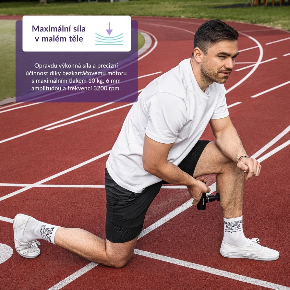 Náročný sportovní trénink si zaslouží vykompenzovat relaxací. Masážní pistole je tím pravým pomocníkem, který napomáhá uvolnění a regeneraci svalů. Sportovně založení ocení i to, že jim masáž napomůže zlepšit rozsah pohybu a zvýšit výkonnost. V masážní pistoli, která je lehká a dobře sedne do ruky se totiž ukrývá síla přítlaku 10 kg a pracuje frekvencí 3 200 kmitů za minutu. Amplituda činí 6 mm a máte možnost si zvolit z 5 intenzit masáže.
