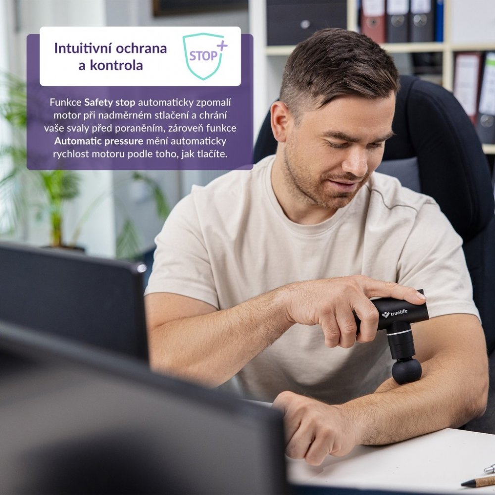 Masáž lze provádět bez obav v pohodlí domova. Funkce Automatic Pressure hlídá vyvíjený tlak a přizpůsobuje mu frekvenci pohybů. Čím více zatlačíte, tím více se zrychlí pohyby. Funkce Safety Stop zase motor automaticky zpomalí, pokud při masáži zatlačíte až příliš. Může dojít až k úplnému vypnutí, aby nedošlo ke zranění. Užití je velice snadné, pro ovládání stačí jedno tlačítko. Po 15 minutách používání se pistole automaticky vypne. Malé a odolné hliníkové tělo ukrývá dobíjecí lithiovou baterii, která vydrží až 5 hodin činnosti. Při masáži nebudete nikoho rušit, provoz je velmi tichý.